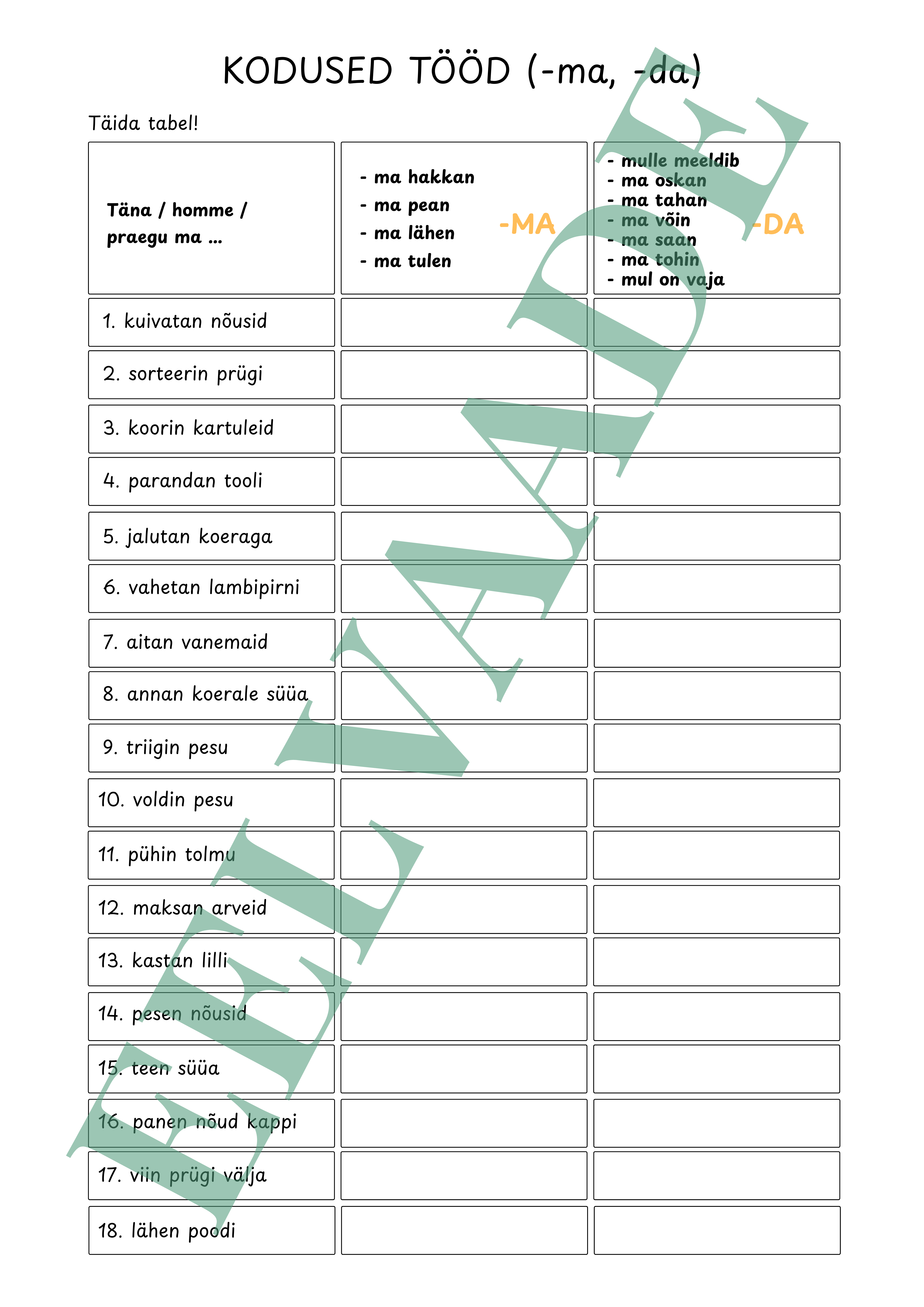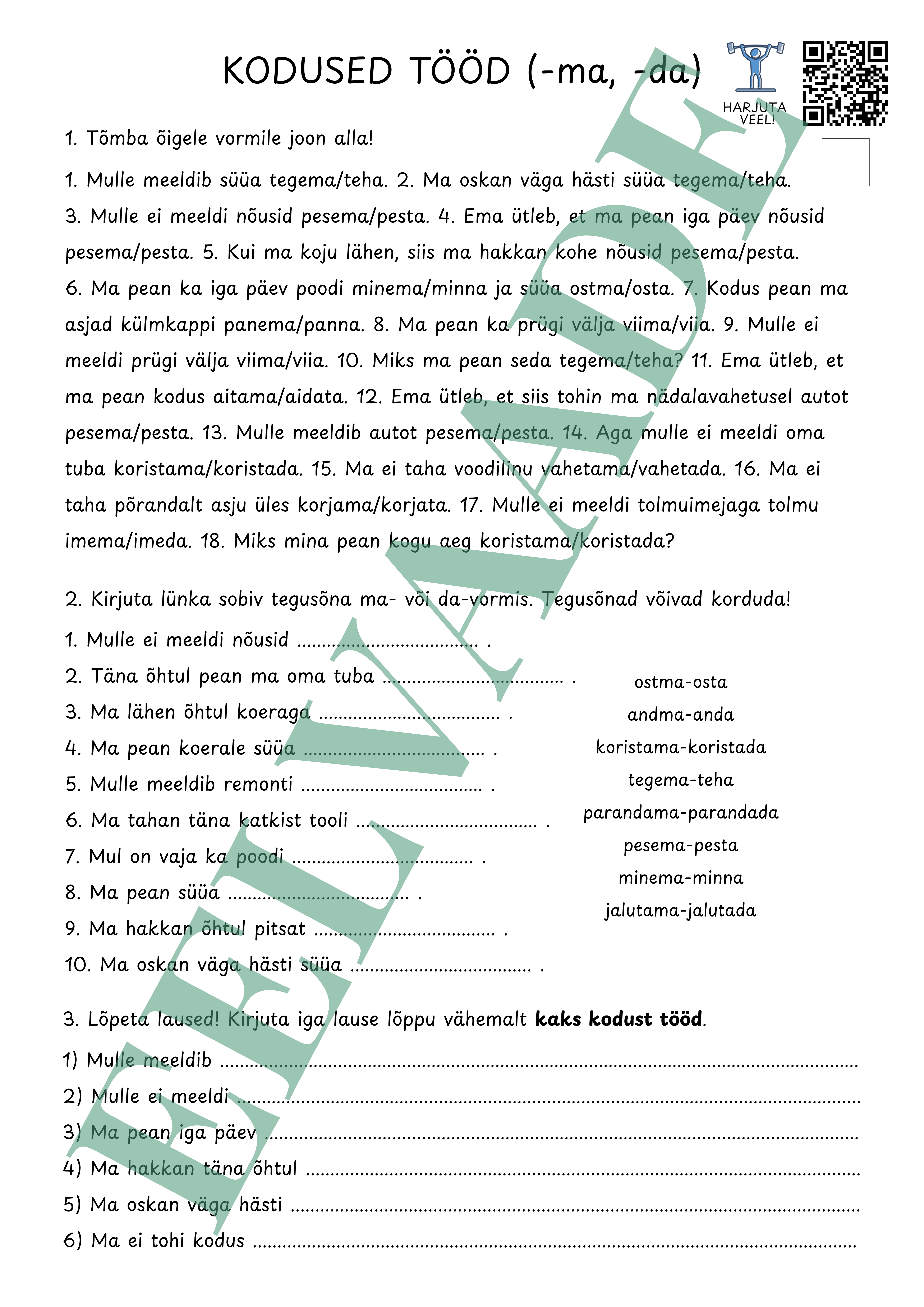 – Harjutada ma- ja da-infinitiivi, olevikku ja lihtminevikku.