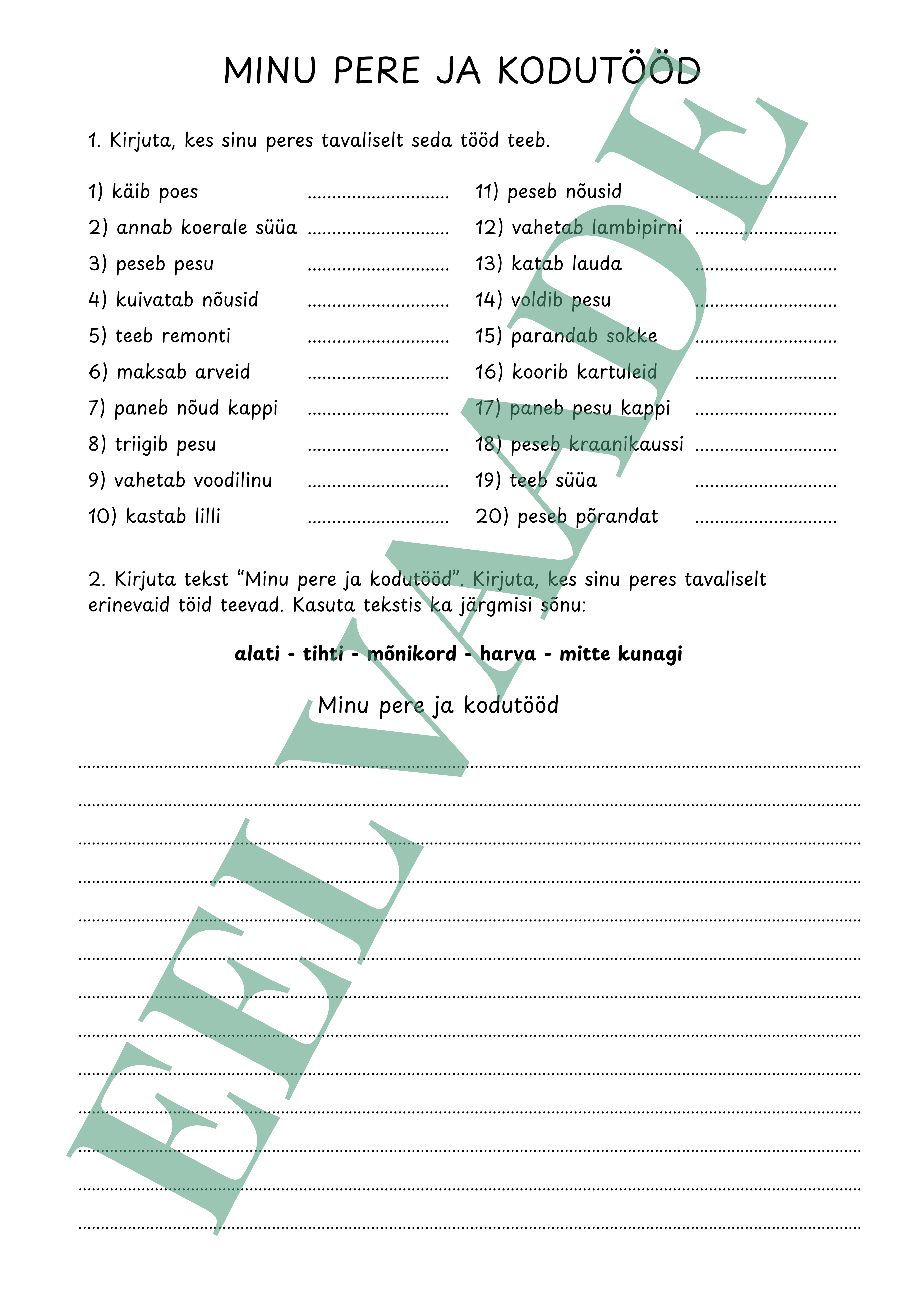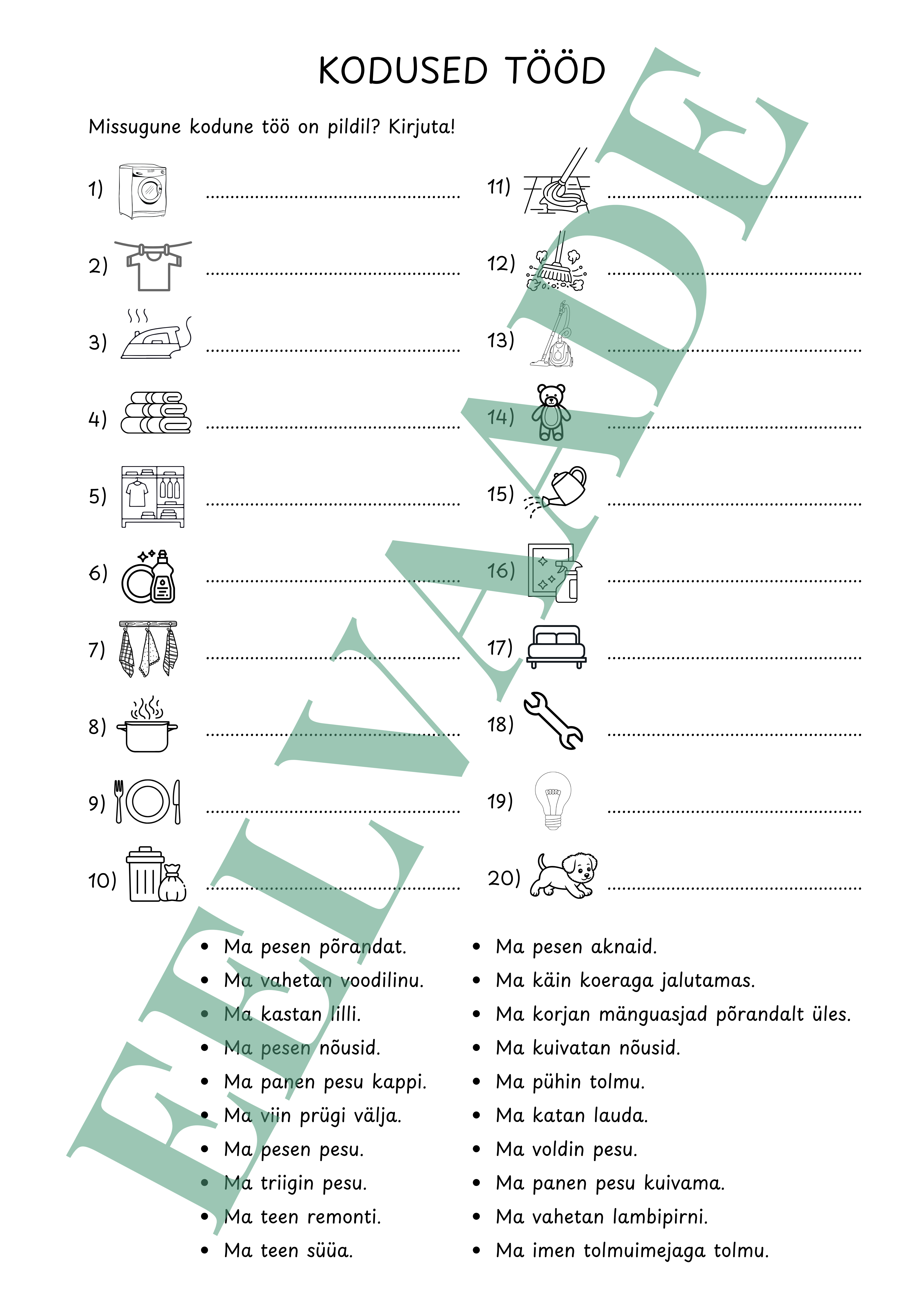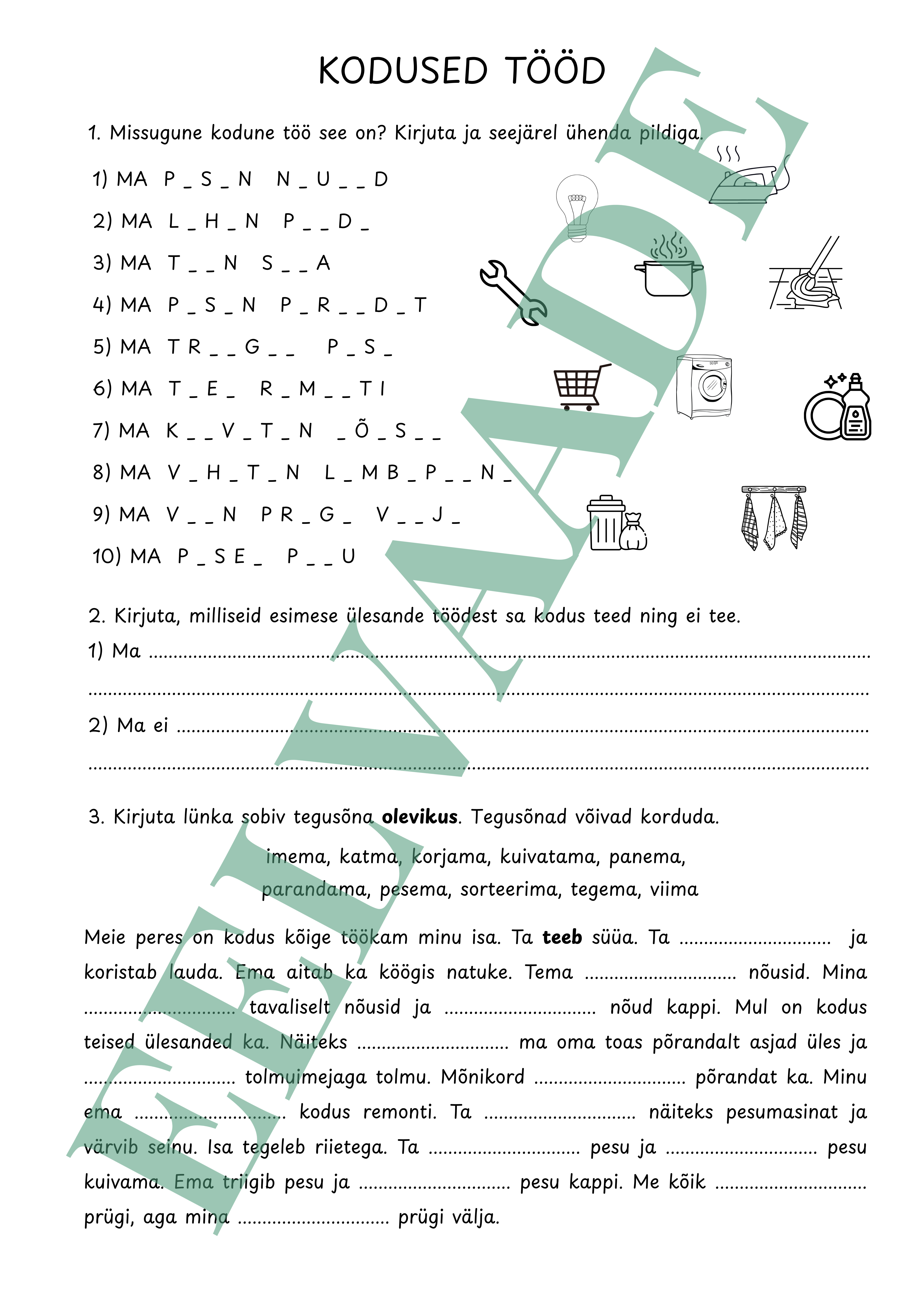 Töölehtede komplekt, mille abil saab eesti teise keele teise keelena tunnis tegeleda kodutööde (majapidamistööde) teemaga. Töölehed on LAK- ja printimissõbralikud (mustvalged). Kõik töölehed on eelvaatest nähtavad ja neid on võimalik soetada ka üksikult.