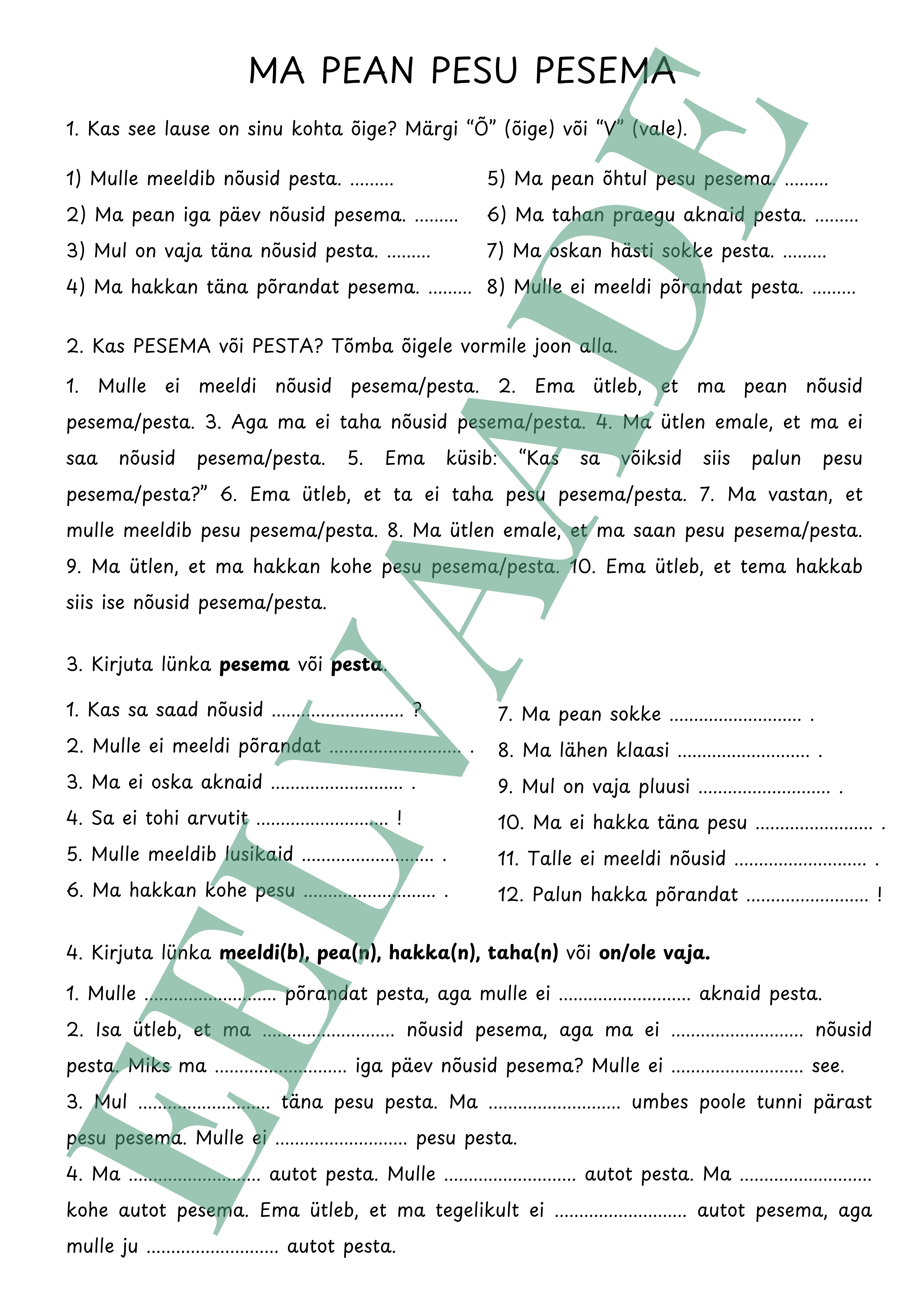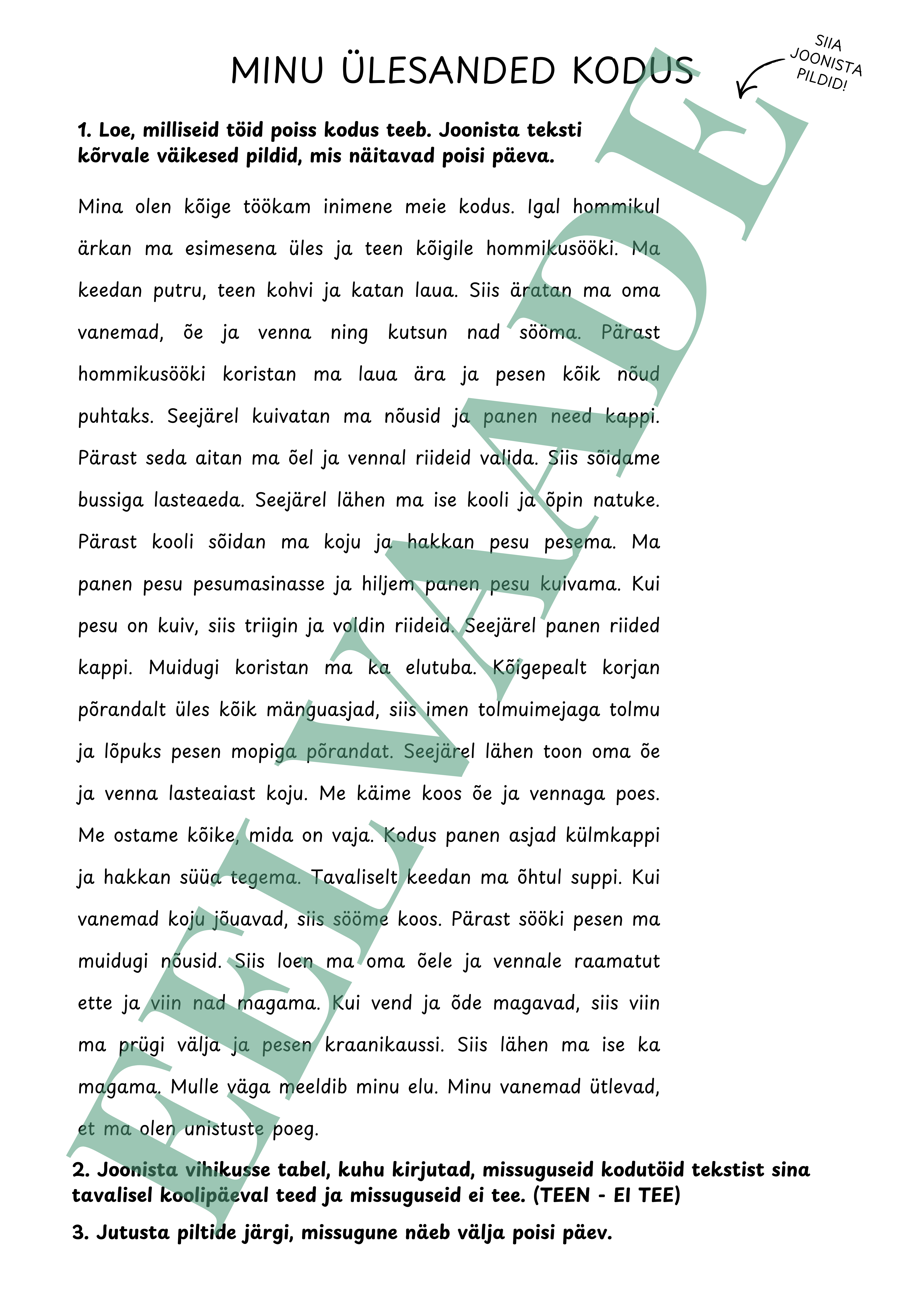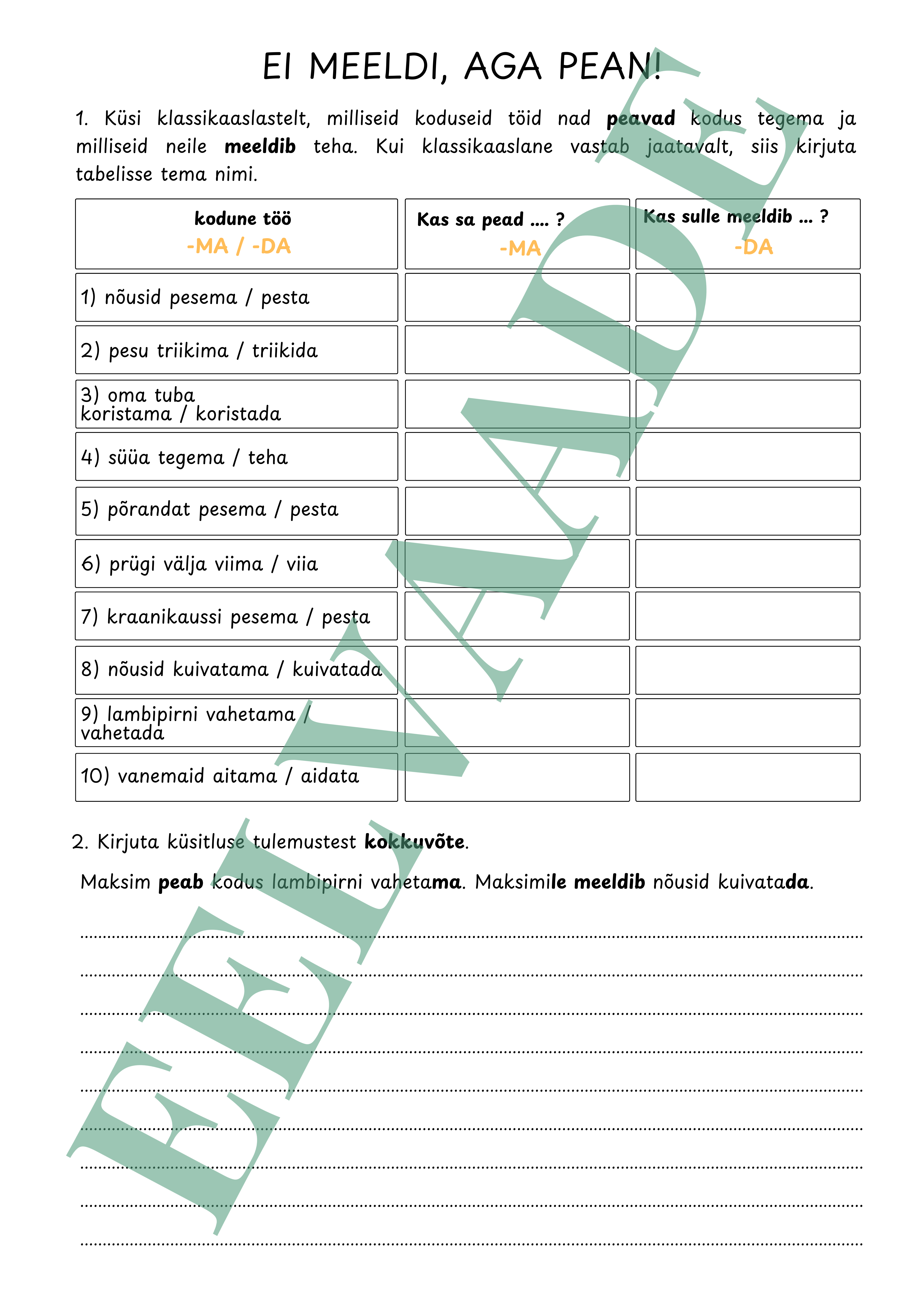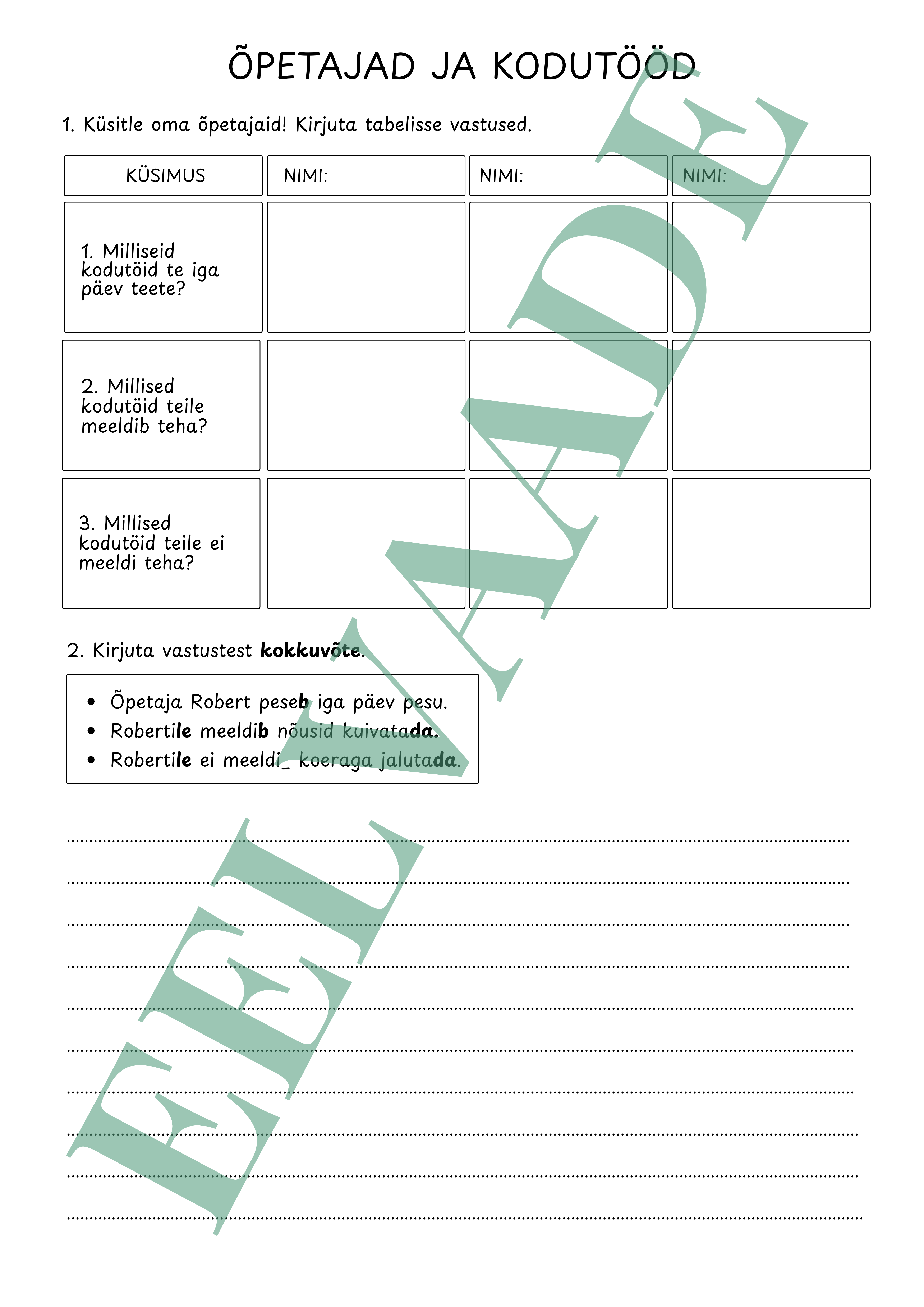 Töölehtede komplekt, mille abil saab eesti teise keele teise keelena tunnis tegeleda kodutööde (majapidamistööde) teemaga. Töölehed on LAK- ja printimissõbralikud (mustvalged). Kõik töölehed on eelvaatest nähtavad ja neid on võimalik soetada ka üksikult.