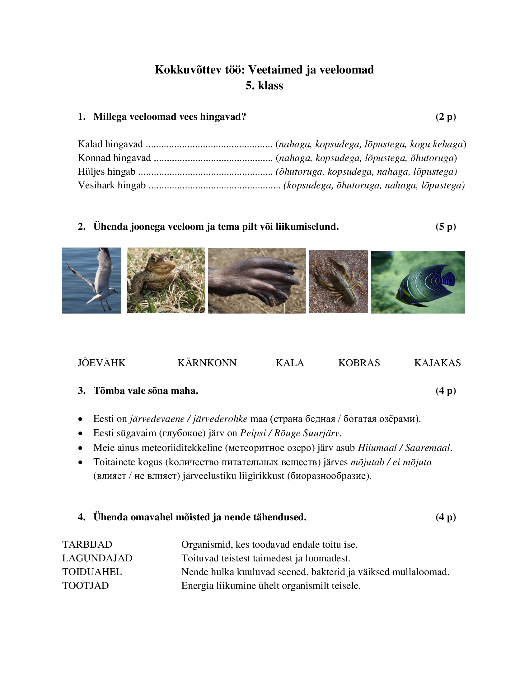 Kokkuvõttev veeorganismide töö 5. kl vene emakeelega õpilastele.