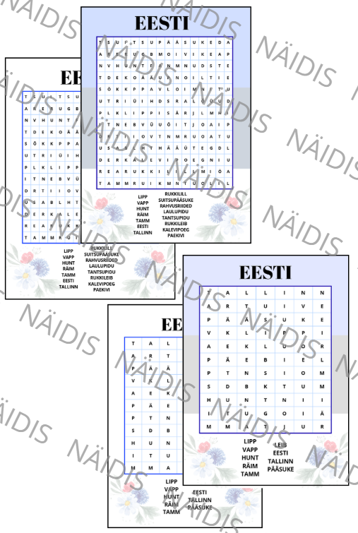 Komplekt: Eesti sõnarägastikud (lihtsam ja raskem). Failis on nii sini-must-valgel kui ka valgel põhjal töölehed ning vastused.