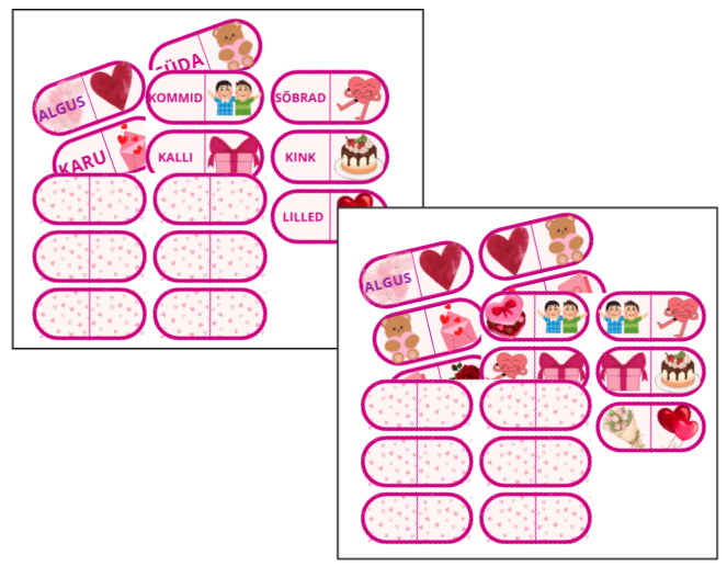 Sõbrapäeva/valentinipäeva doomino piltidega ja sõnadega. Mõlemas mängus kokku 18 mängukaarti.