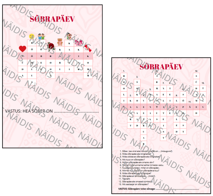 Sõbrapäeva ristsõnad (küsimustega, piltidega). Failis on nii roosal kui ka valgel põhjal ristsõnad ning vastused.
