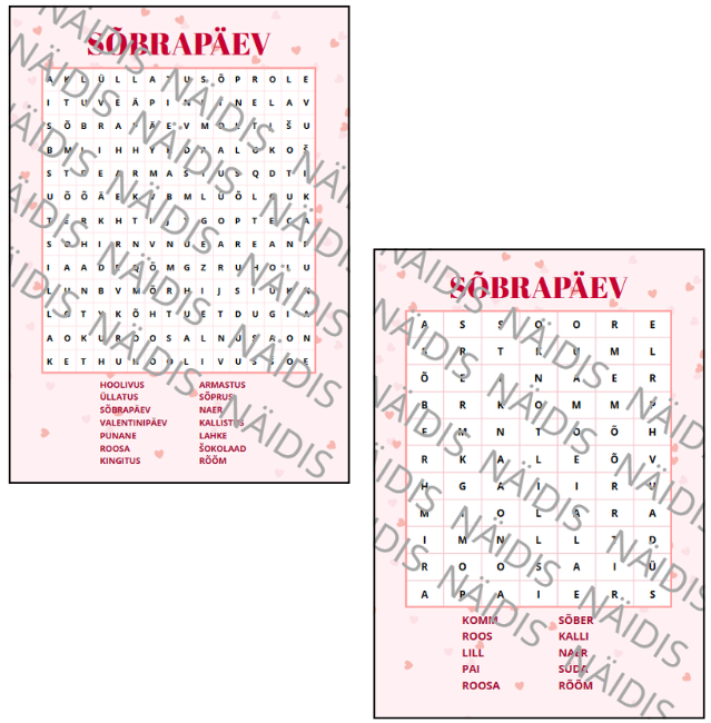 Komplekt: sõbrapäeva/valentinipäeva sõnarägastikud (lihtsam ja raskem)