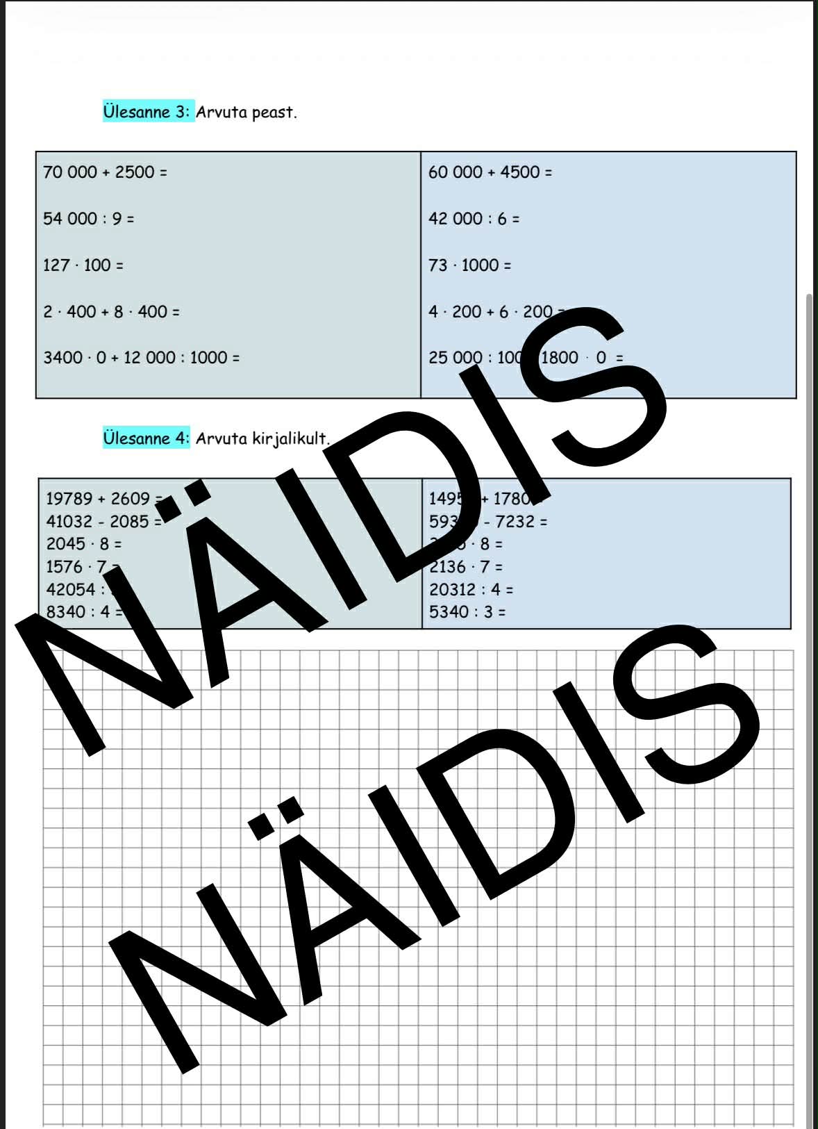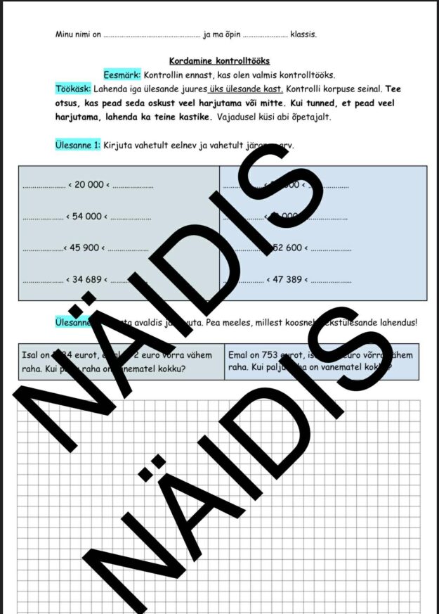 See tööleht on loodud selleks, et õpilane saaks iseseisvalt kontrollida ja kinnistada oma matemaatikaoskusi enne kontrolltööd. Tööleht sisaldab mitut tüüpi ülesandeid: arvude järjekorra mõistmist, tekstülesannete koostamist ja lahendamist, peastarvutamist ning kirjalikku liitmist, lahutamist, korrutamist ja jagamist (kuni 100 000-ni). Õpilane saab iga ülesande juures valida sobiva raskusastme, lahendades kas ühe või kaks kastikest. See annab hea ülevaate õpitu omandamisest ning toetab eneseregulatsiooni ja õppimisoskuste arengut. Sobib nii tunnitööks, koduseks harjutamiseks kui ka kontrolltööks valmistumiseks.