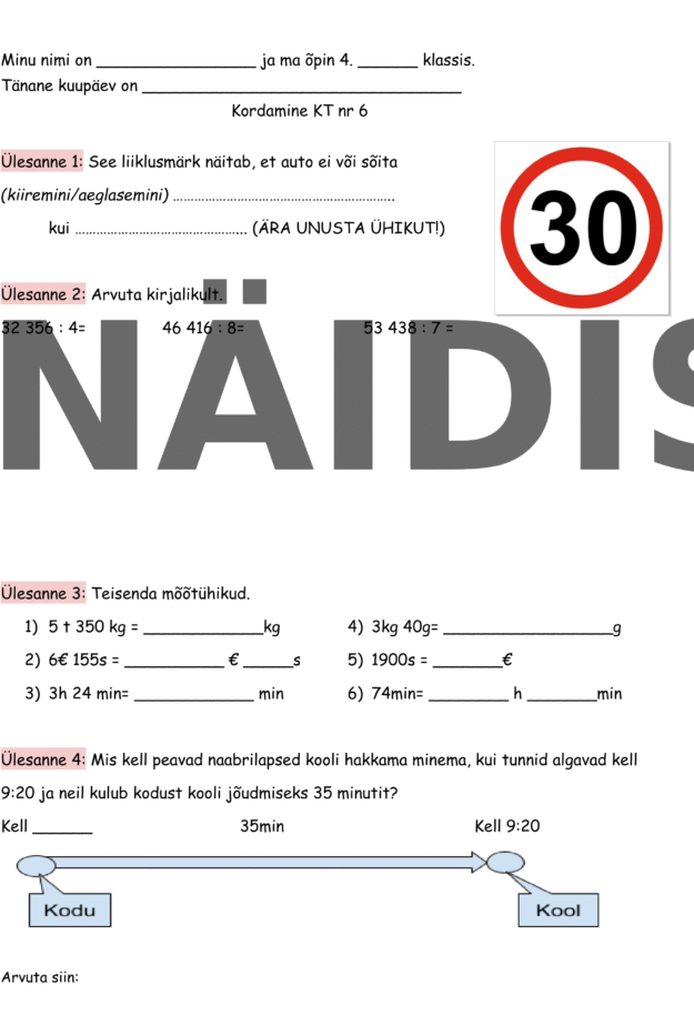 „Kordamine KT nr 6“ on põhjalik kordamistöö, mis hõlmab massi-, raha- ja ajaühikute teisendamist, kirjalikku jagamist, temperatuuride võrdlemist ning kiiruse, teepikkuse ja aja omavahelisi seoseid.