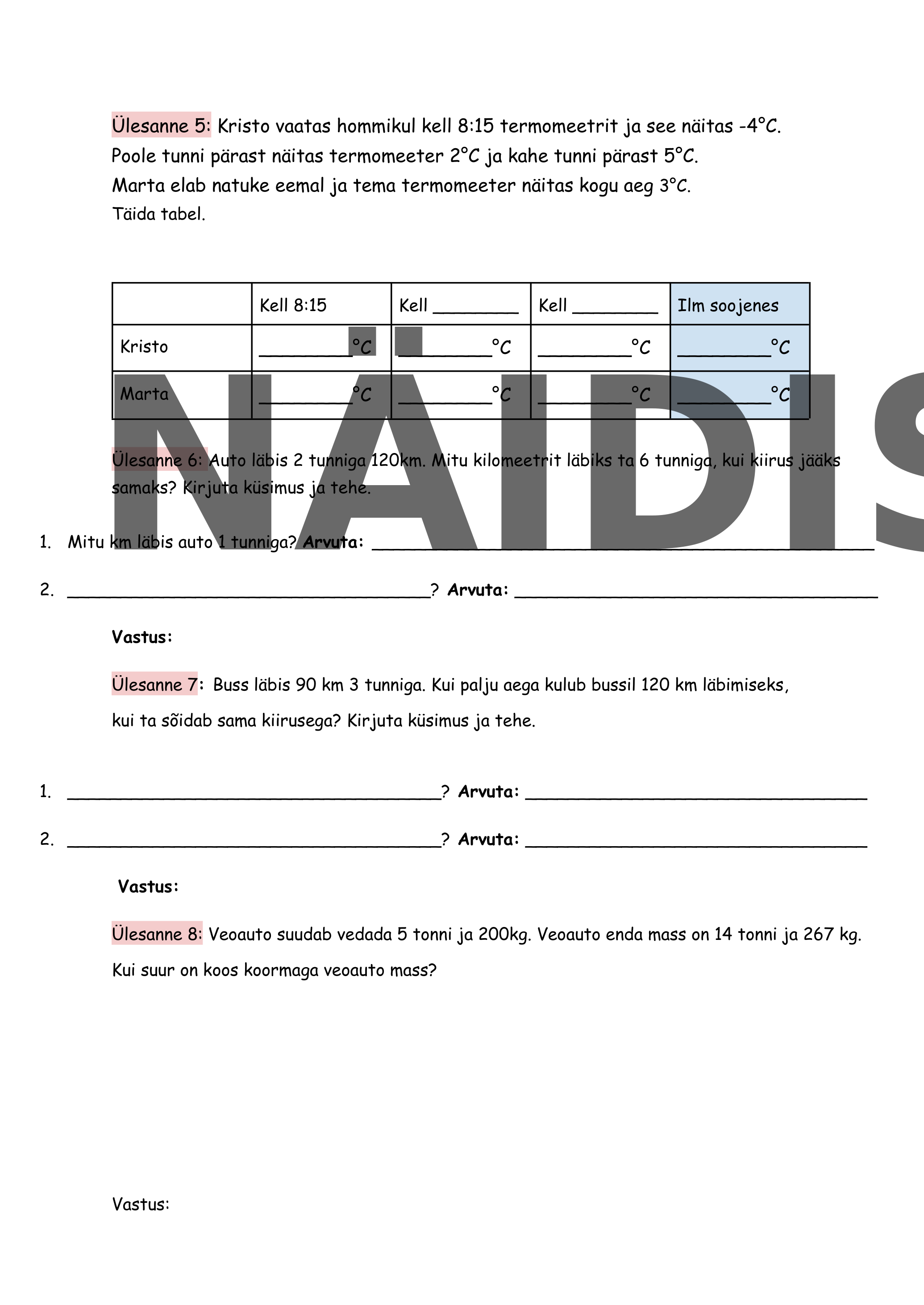 Õpilane lahendab nii praktilisi igapäevaelust võetud ülesandeid (liikluskiirus, termomeetri näidu muutus, bussiga sõitmine) kui ka arvutusülesandeid, mis arendavad loogilist mõtlemist. Tööleht sobib hästi kontrolltööks valmistumiseks ja õpitu kinnistamiseks.