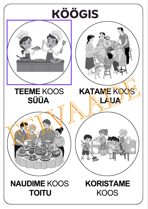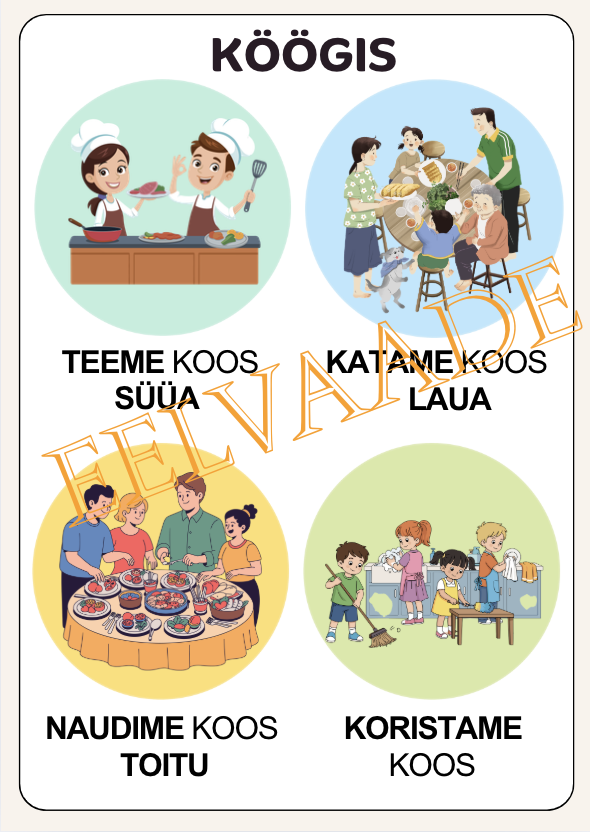 - PLAKATIFAIL, millel on 4 pilti ja pilte kirjeldavad tekstid: TEEME KOOS SÜÜA; KATAME KOOS LAUA; NAUDIME KOOS TOITU; KORISTAME KOOS. Fail sisaldab nii värvilist kui mustvalget versiooni.