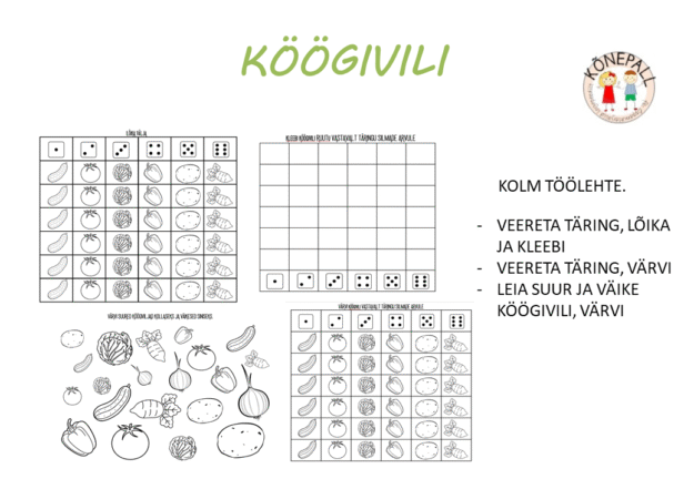 Materjalis on kolm töölehte. Kahe puhul kasutatakse täringut, seejärel valitakse pilt (lõika ja kleebi või värvi). Kolmandal töölehel valitakse viljade hulgast suurimad ja väikseimad ning värvitakse.