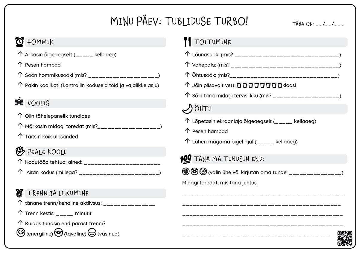 Plaani eesmärk on motiveerida last oma päevategevusi jälgima. See aitab arendada teadlikkust oma päevast, treeningust ja toitumisest. Samuti annab see õpetajale/ lapsevanemale hea ülevaate! Plaan on A4 formaadis.