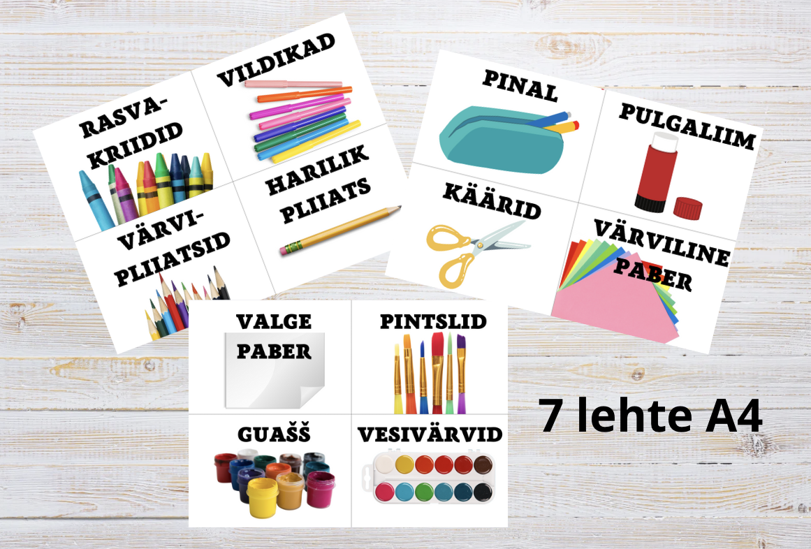7 lehte A4. Ühel lehel 4 pilti+nimetused.