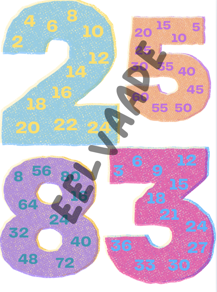 Korrutamistehete vastused arvudega 2-9, numbrid eri värvi. Võimalik kasutada abivahendina õppimise ajal.