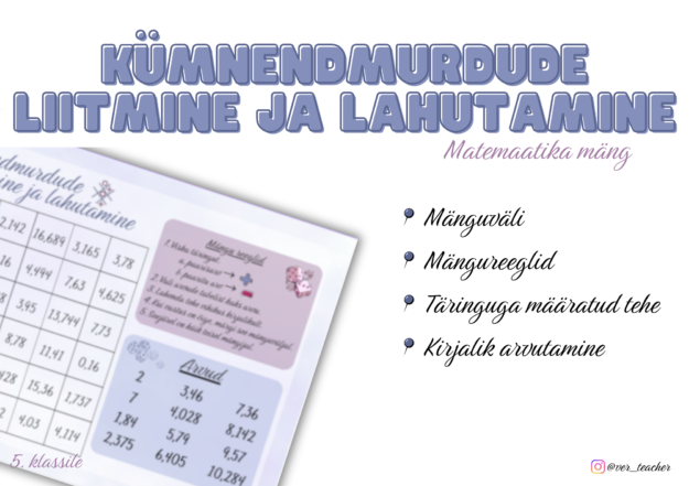 Materjal on mõeldud kümnendmurdude kirjaliku liitmise ja lahutamise harjutamiseks mängulises vormis. Õpilased moodustavad ise tehteid, lahendavad need vihikus kirjalikult ning märgivad õiged vastused mänguväljale.