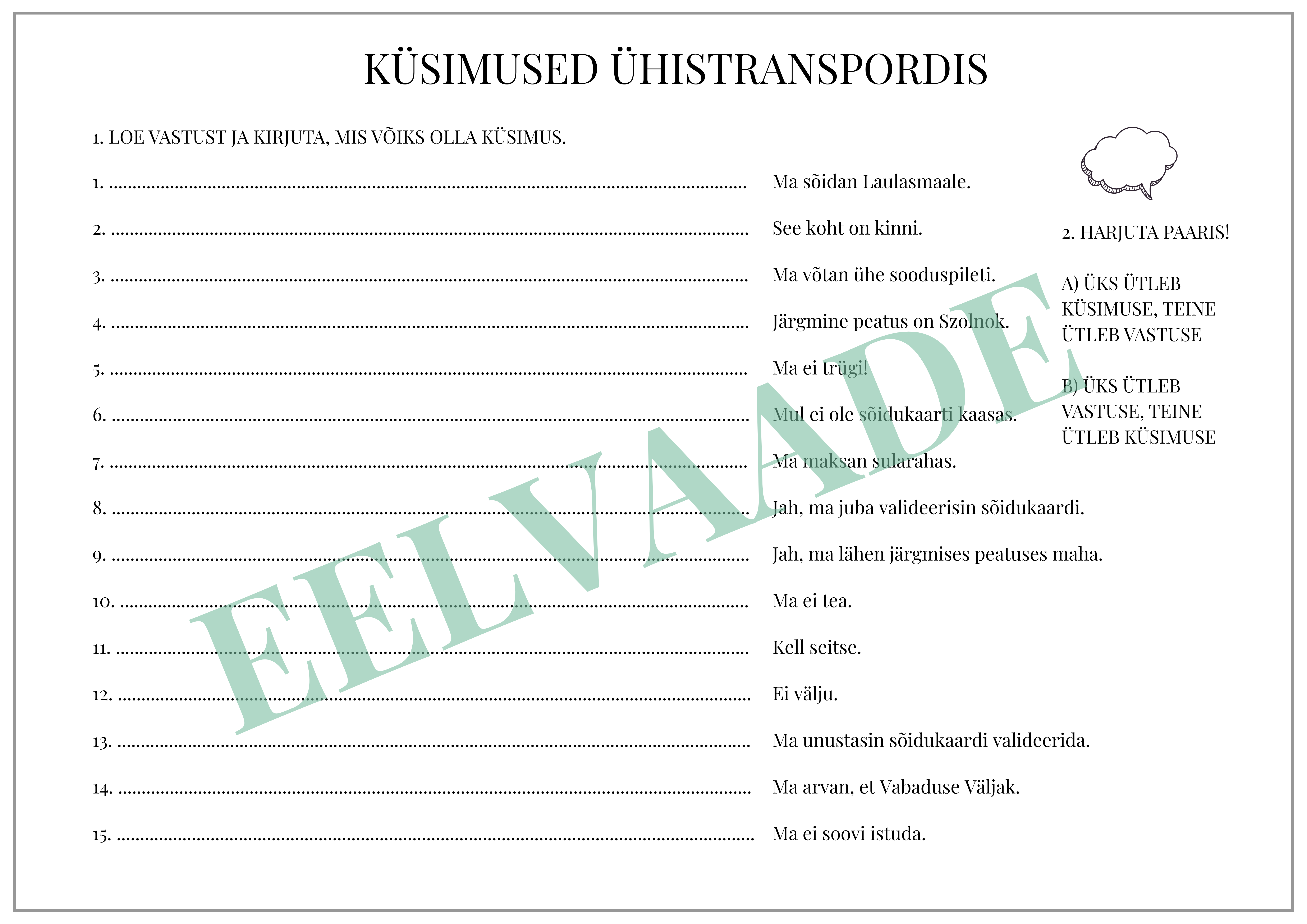 Töölehe abil saab harjutada küsimuste moodustamist ja ühistranspordis vajalikku sõnavara. Õpilased loevad vastust ja kirjutavad küsimuse. Seejärel saab küsimuste esitamist paaris harjutada.