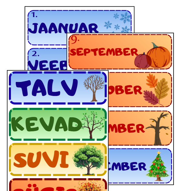 Kuude ja aastaaegade sedelid seinale. Sobib kasutamiseks nii lasteaias kui ka algklassides.