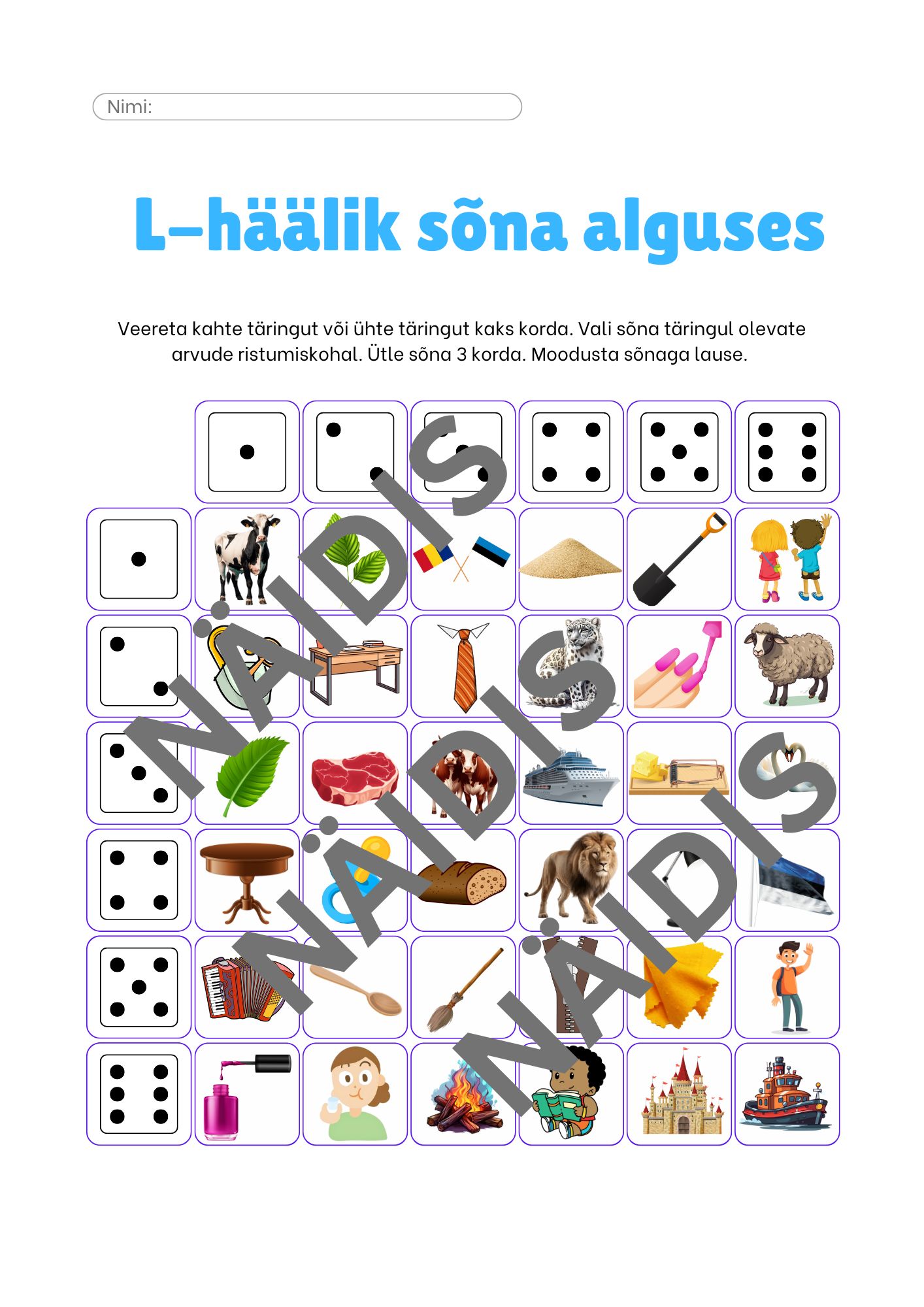 Täringumäng L-hääliku kõnesse viimiseks: L sõna alguses, keskel, lõpus ning mitmes positsioonis ja häälikuühendis (kokku 4 lehte).