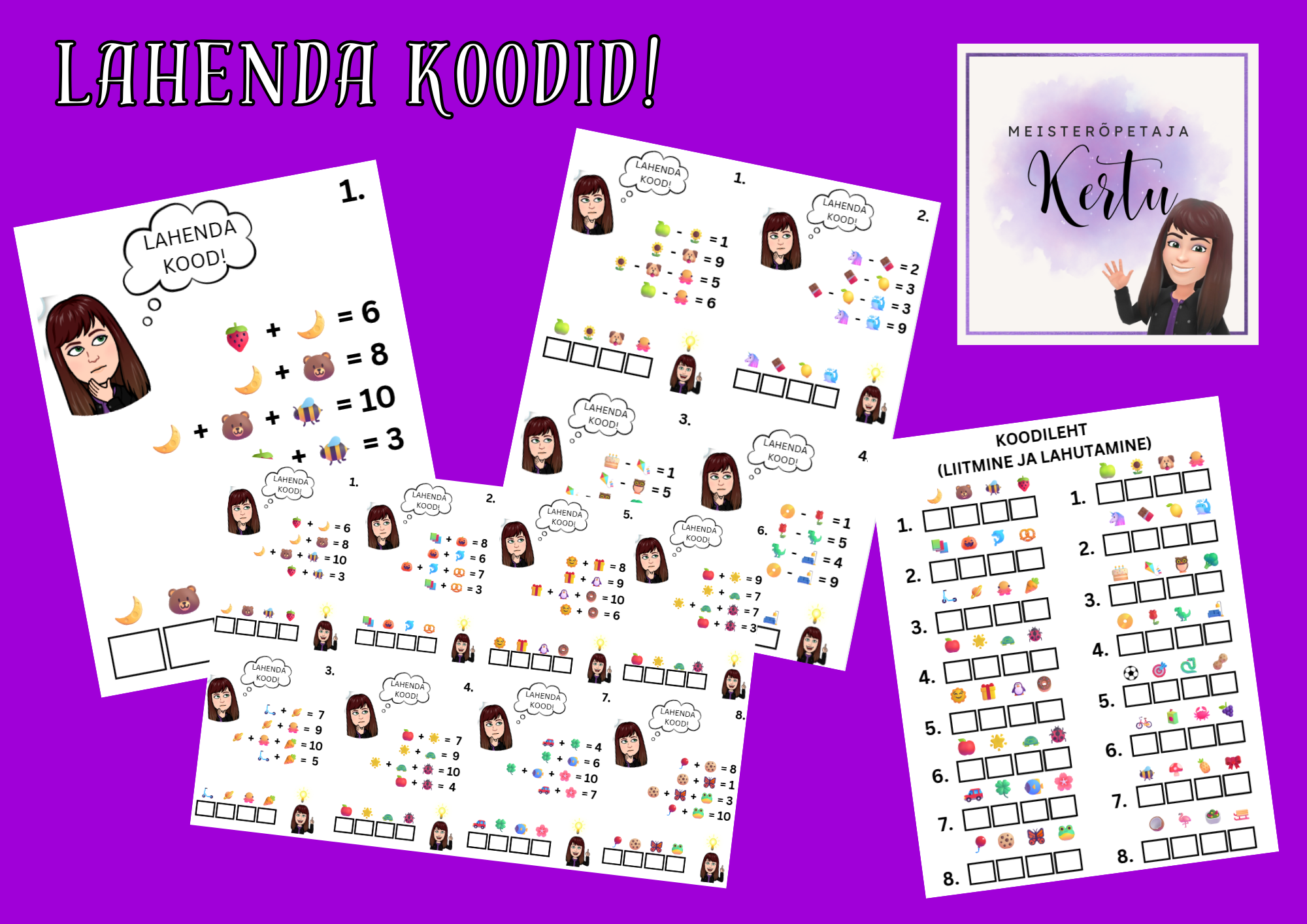 See ost sisaldab Canva linki, kus leiad 2 komplekti (8+8) koodide lahendamise ülesandeid: 10 piires liitmine ja 10 piires lahutamine.