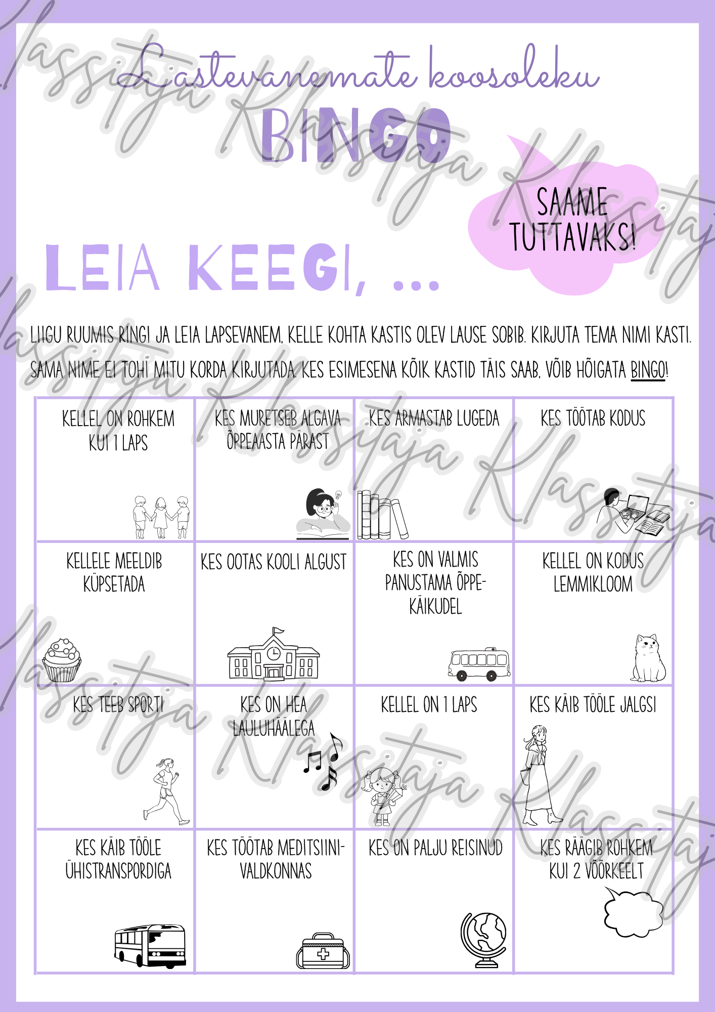 Lastevanemate koosoleku jaoks loodud “Leia keegi, kes …” bingod, mis aitavad vanematel lõbusal ja mängulisel viisil üksteist paremini tundma õppida ning loovad koosolekul sõbraliku ja avatud õhkkonna.