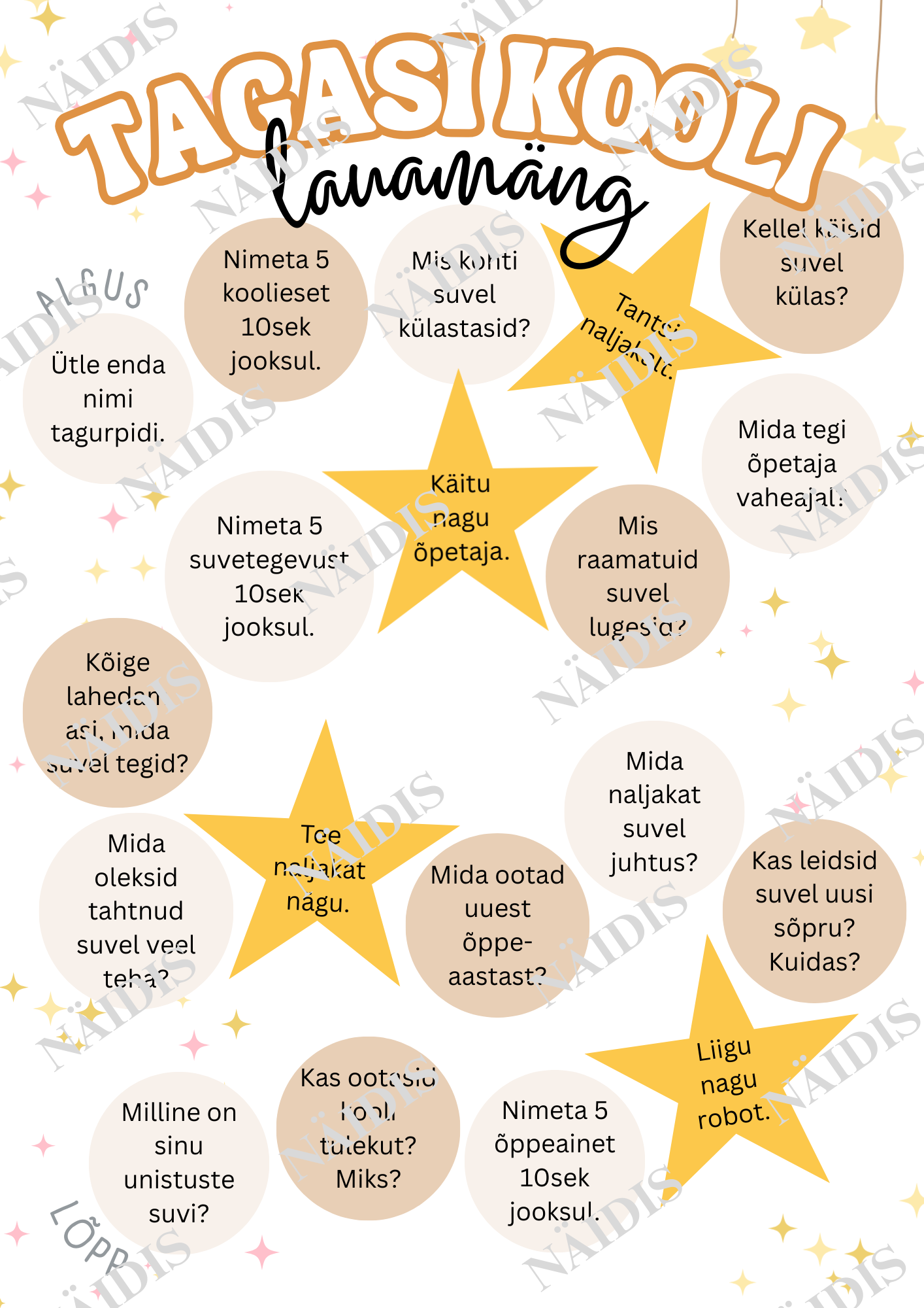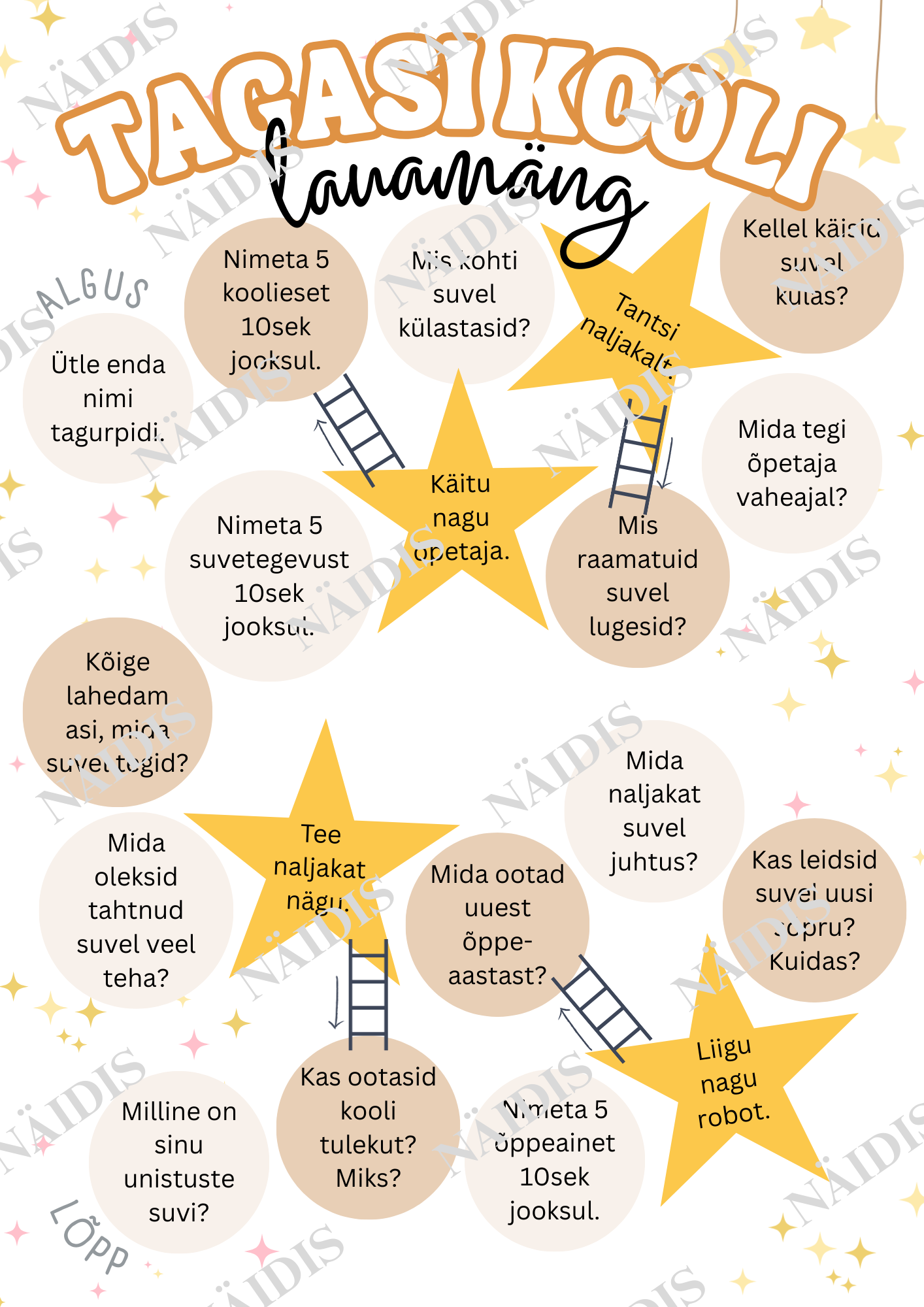 Mõnus tegevus esimesteks koolipäevadeks. Õpilased saavad mängu käigus rääkida enda suvevaheajast kaaslastele. Mängu eesmärk on jõuda lõppu. Failis on kaks versiooni, millest üks edasi ja tagasi liikumistega (redelitega) ning teine tavaline. Võimalus printida mäng A3 või A4 formaadile.