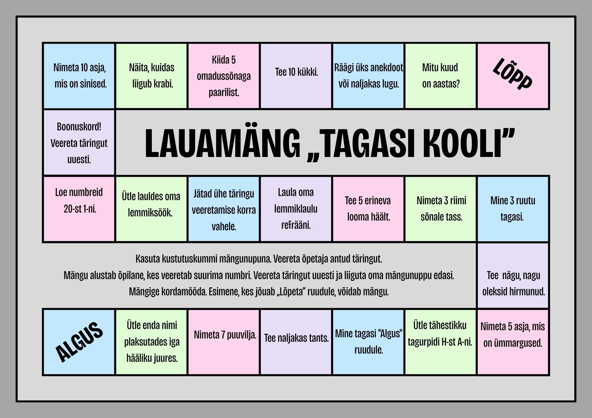 Lauamäng ,,Tagasi kooli” 1 lk pdf formaadis (A4). Antud lauamängu saab mängida iga kord, kui vaheaeg saab läbi (suvine, talvine jne).