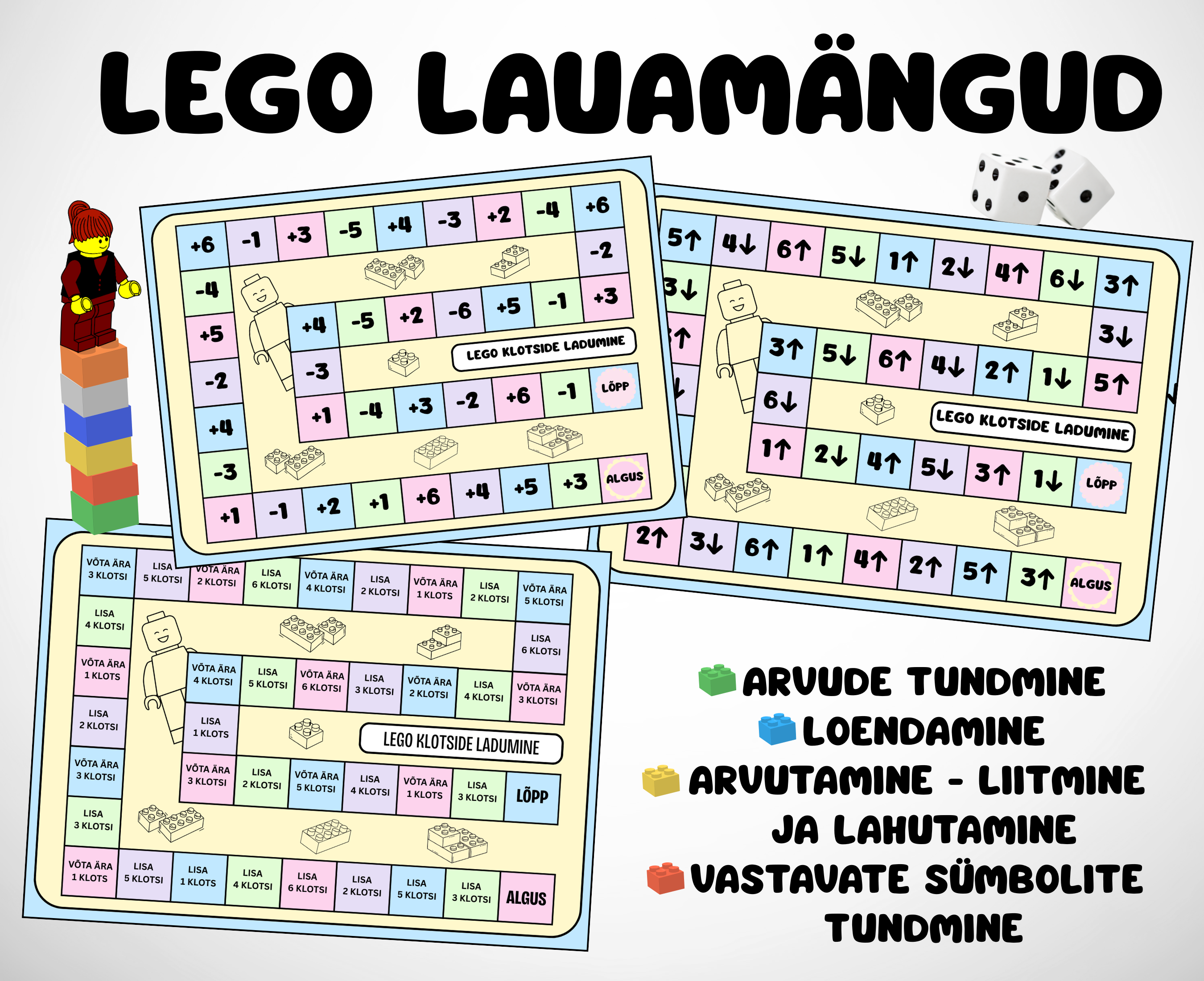 3 matemaatilist täringumängu lego klotsidega.