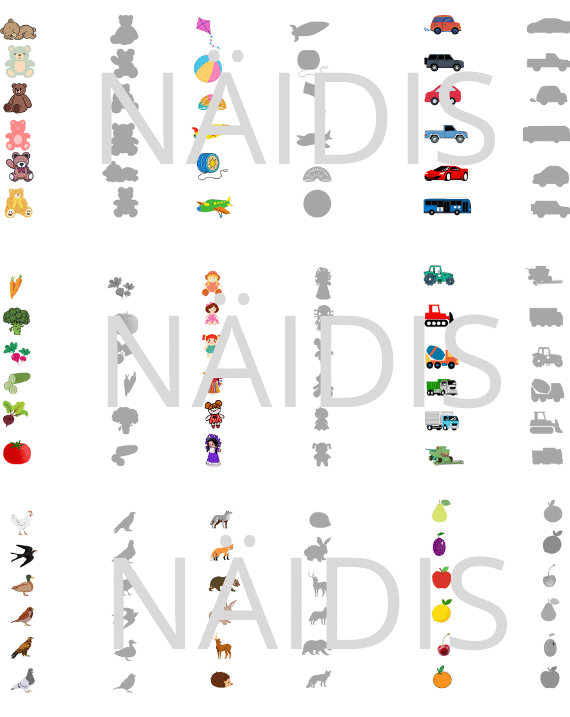 10 lehekülge piltide ja varjudega, laps otsib pildile õige varju.