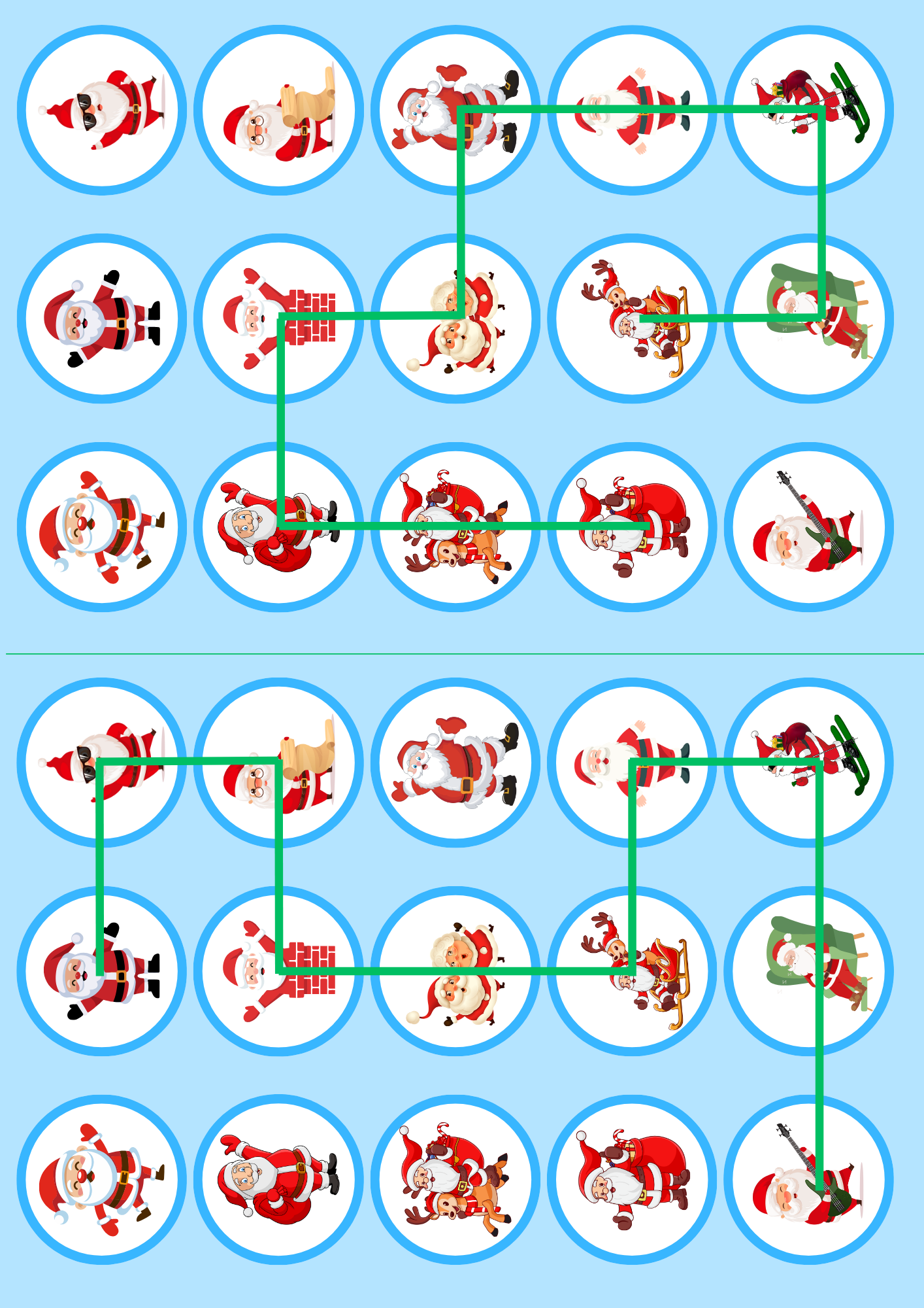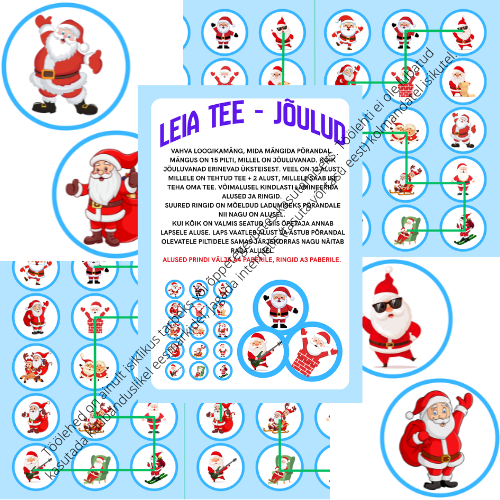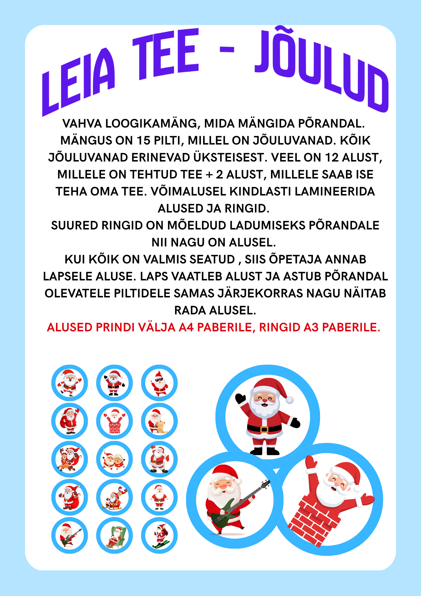 MÄNGUS ON 15 PILTI, MILLEL ON JÕULUVANAD. KÕIK JÕULUVANAD ERINEVAD ÜKSTEISEST. VEEL ON 12 ALUST, MILLELE ON TEHTUD TEE + 2 ALUST, MILLELE SAAB ISE TEHA OMA TEE. VÕIMALUSEL KINDLASTI LAMINEERIDA ALUSED JA RINGID.