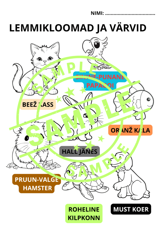 Sobib tunni sissejuhatuseks, et korrata värve ja lemmikloomi. Kui õpilastele valmistab raskuseid lugemine, on vihjeks teksti ümbrus värviga.
