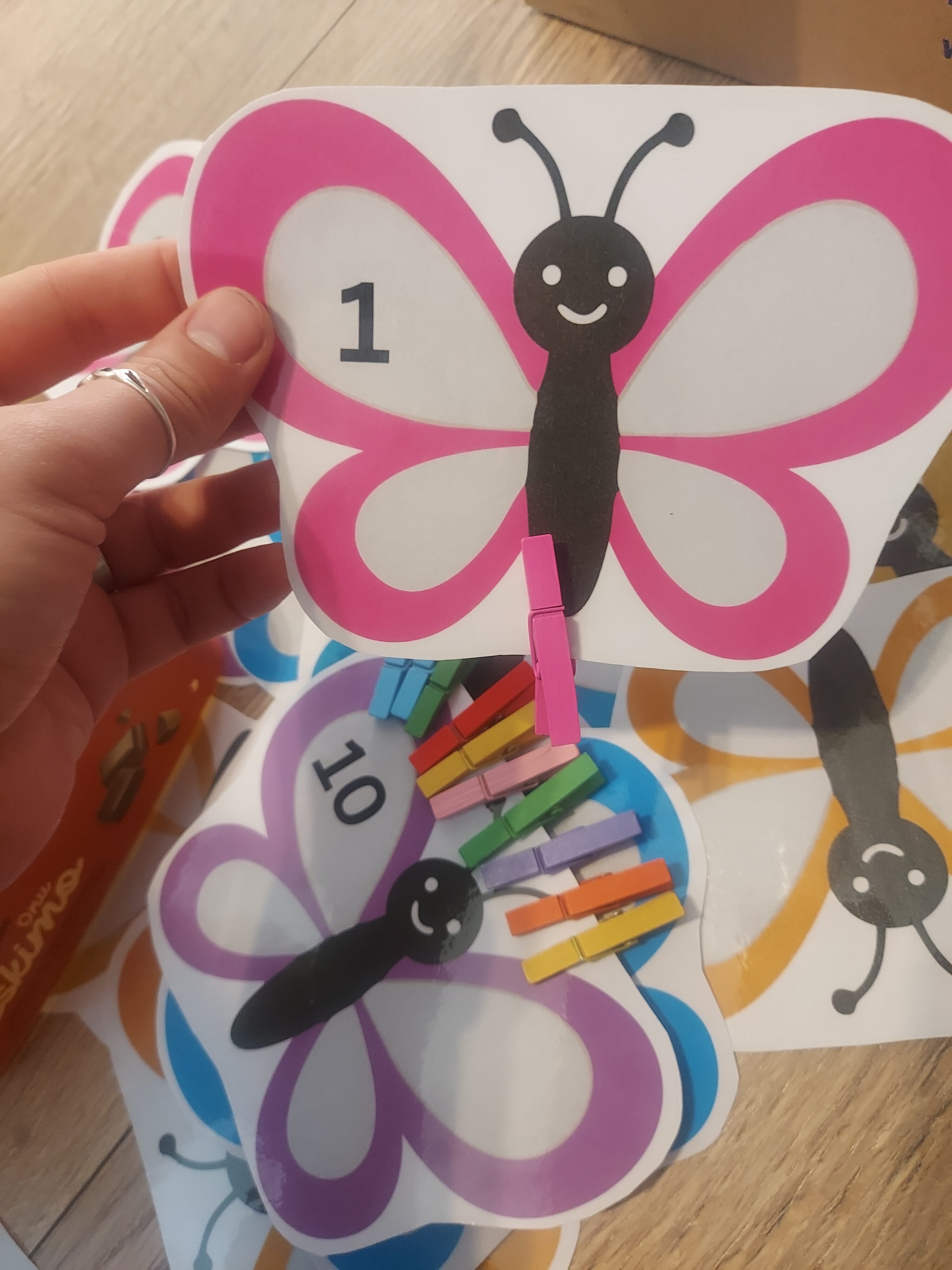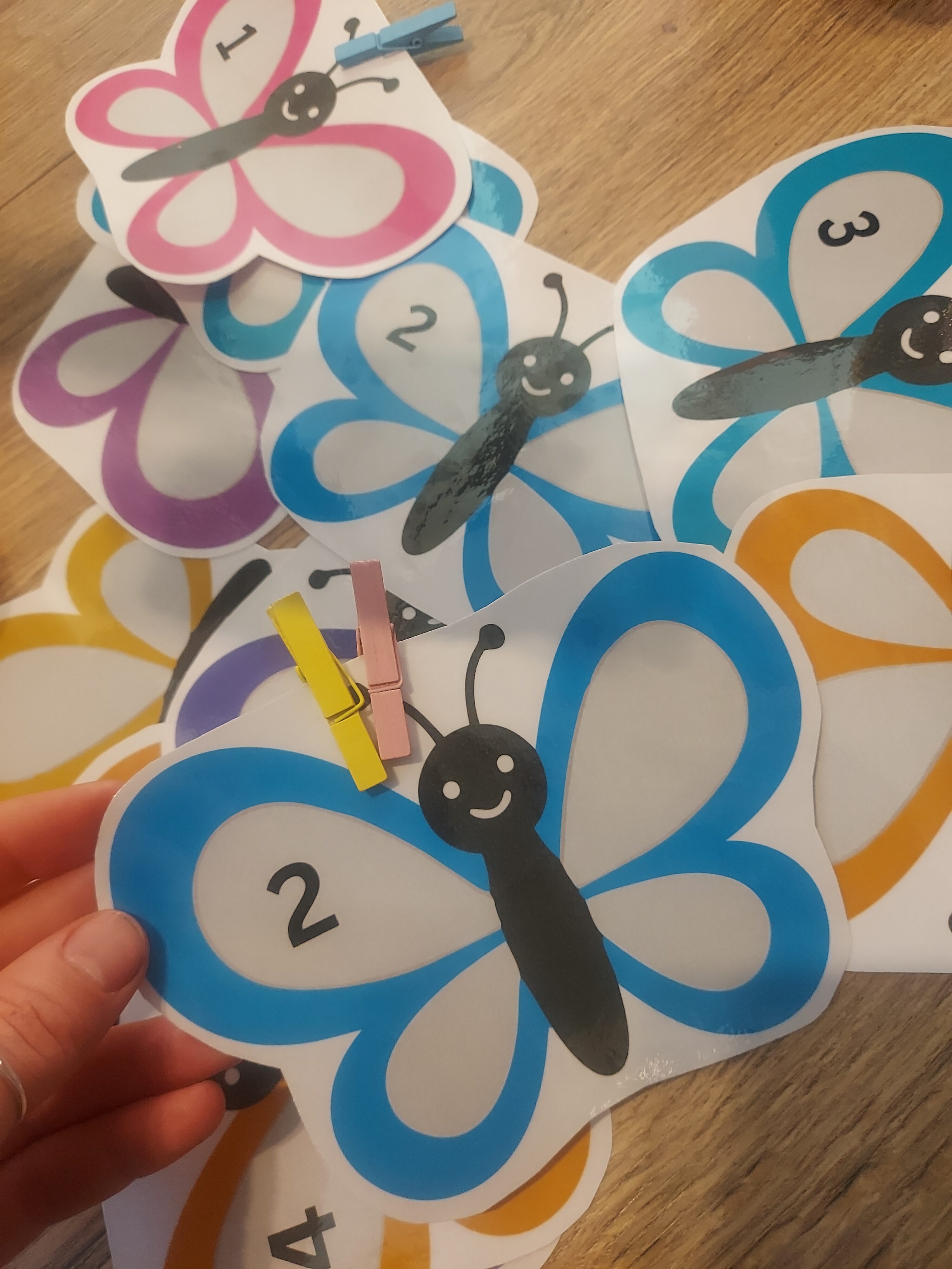 Toode on PDF-failina ja komplekti kuulub 10 liblikat. Igal liblikal on kirjas üks number. Laps saab liblikate külge panna näiteks vastava arvu pesulõkse või münte või midagi muud sobivat. Liblika suurus on A5.