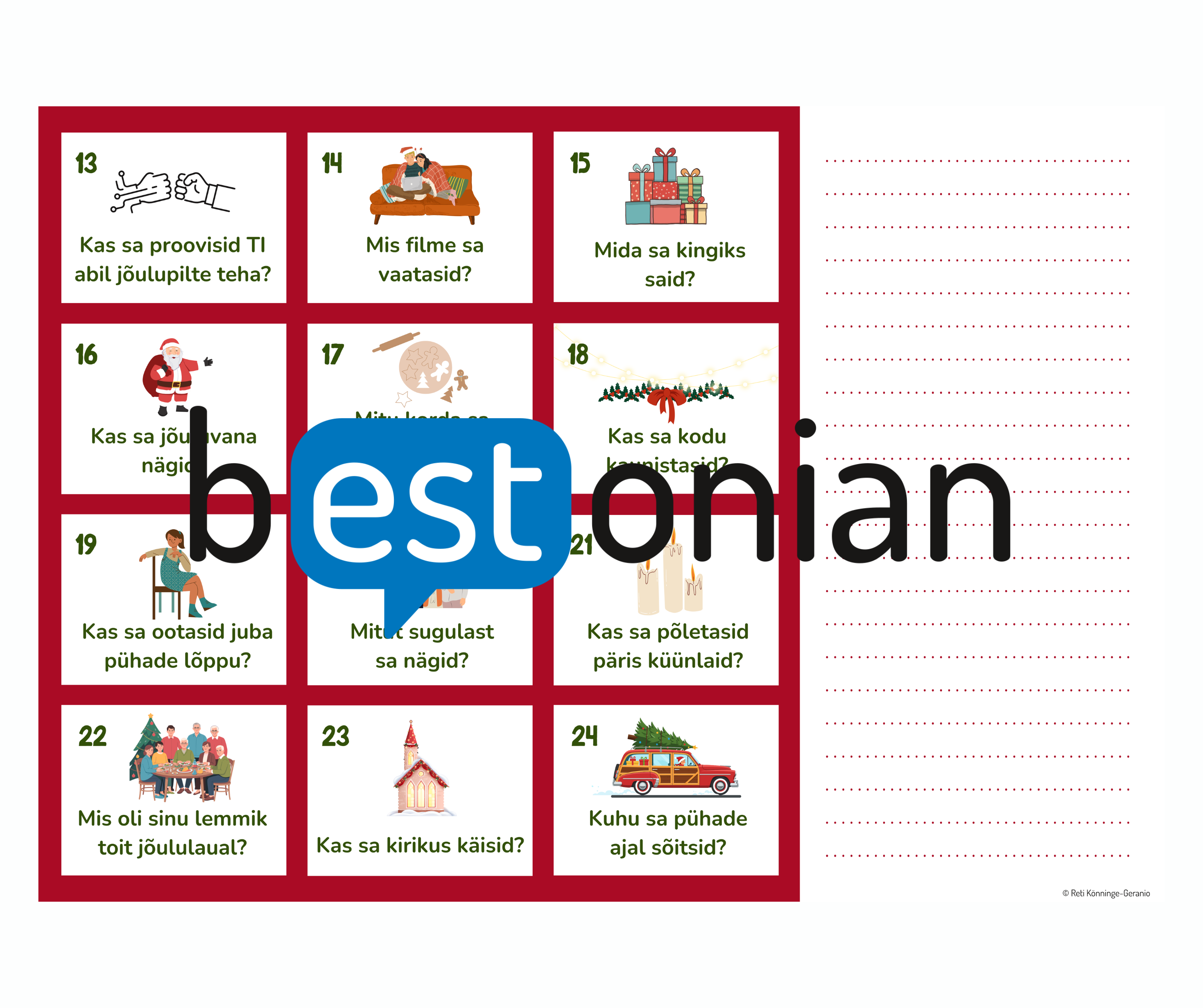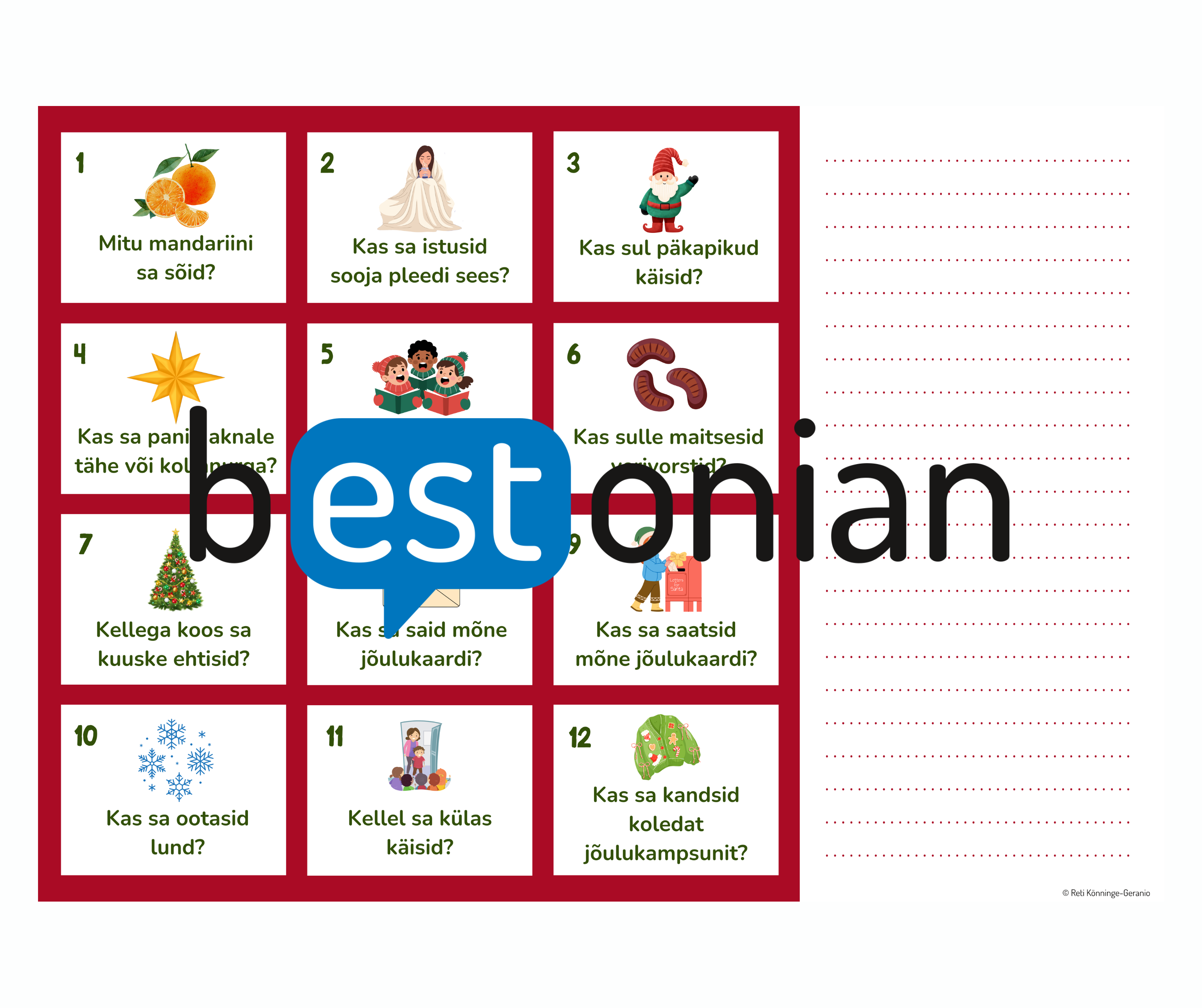 2in1 vestluskaardid/töölehed “Mida sa pühade ajal tegid?”. Lisaks tuleb kaasa digitaalseks kasutamiseks mugav fail (seina peal või arvutiekraanil näitamiseks). Prindi ja jaga laiali, lõika ja lamineeri või näita arvutist – sama materjali saab kasutada vastavalt enda võimalustele ja vajadustele.