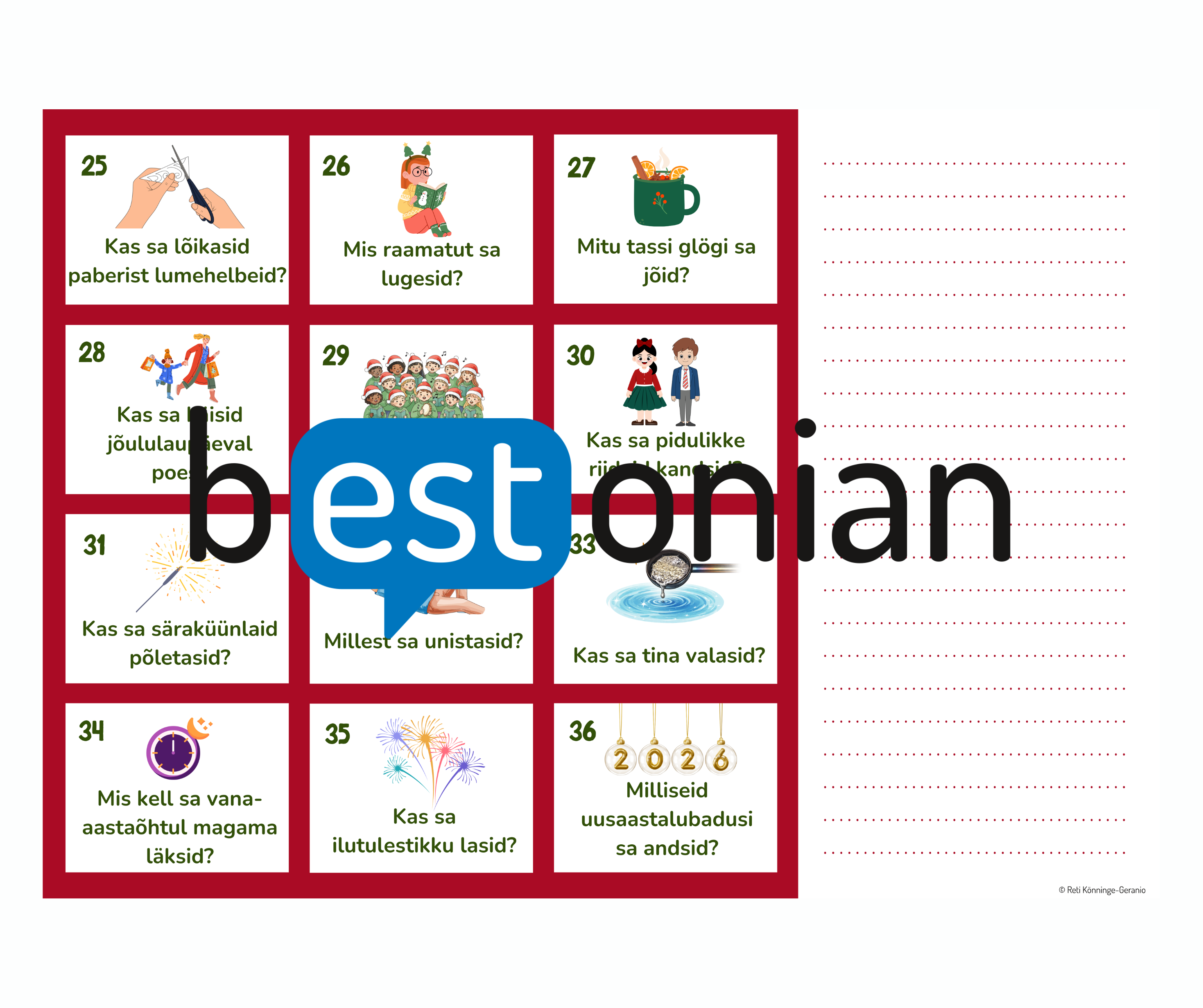 Materjalis on 36 nummerdatud ja illustreeritud sinavormis küsimust möödunud jõulupühade ja vana aasta lõpu kohta. Leidub nii kas-küsimusi kui avatud vastusega küsimusi. Sõnavara ja vormid on (ka tänu illustratsioonidele) algajale keelekasutajale sobilikud, aga vürtsiks sees on ka keerulisemat sõnavara, nt tina valama, uusaastalubadusi andma jms.