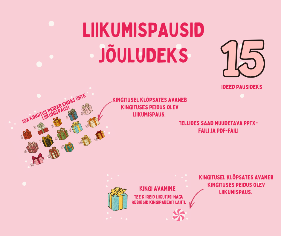 Komplekti kuulub muudetav PPTX-fail ja PDF-fail. Esitluses on 15 liikumispausi ja pause saab valida, kui klõpsata kingitustele. Esilehele saab tagasi, kui klõpata paremas nurgas olevale kommile.