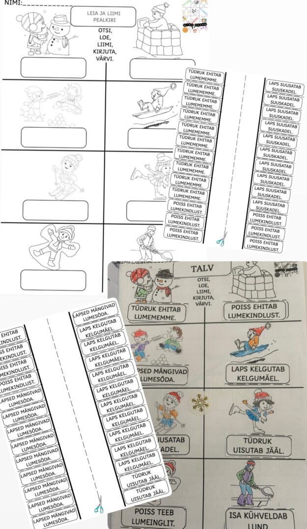 Klassiruumis liikumist soodustavad töölehed, mis sisaldavad liikumist, lugemist, lõikamist, liimimist, nimisõna kirjutamist, värvimist vastavalt töökäsule. Talviste tegevustega laused tuleb lahti lõigata ja panna teibiga klassis erinevatesse kohtadesse. Lapsed otsivad ja loevad endale sobivad sedelid. Lõikavad, liimivad ja värvivad.
