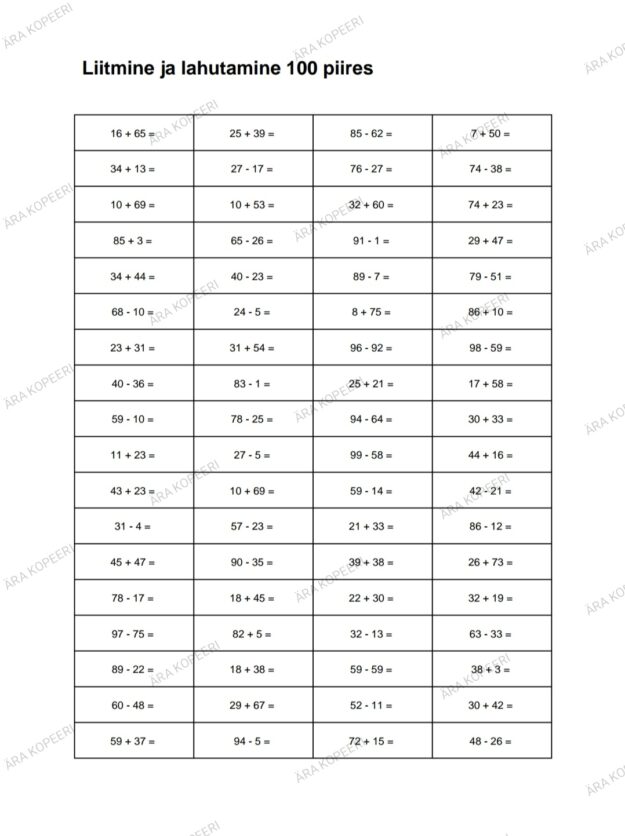 Liitmine ja lahutamine 100 piires, pdf failina. Kokku 200 tehet.
