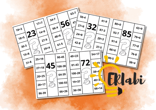 Kaardid suulise või kirjaliku liitmise ja lahutamise oskuse kinnistamiseks 100 piires. Iga kaardi peal on viis õiget vastust. Laps peab ülesannet lahendama ja seejärel kontrollima, kas tema vastus vastab kaardil olevale arvule. Õige vastuse märkimiseks võib kasutada nt pesulõksu.