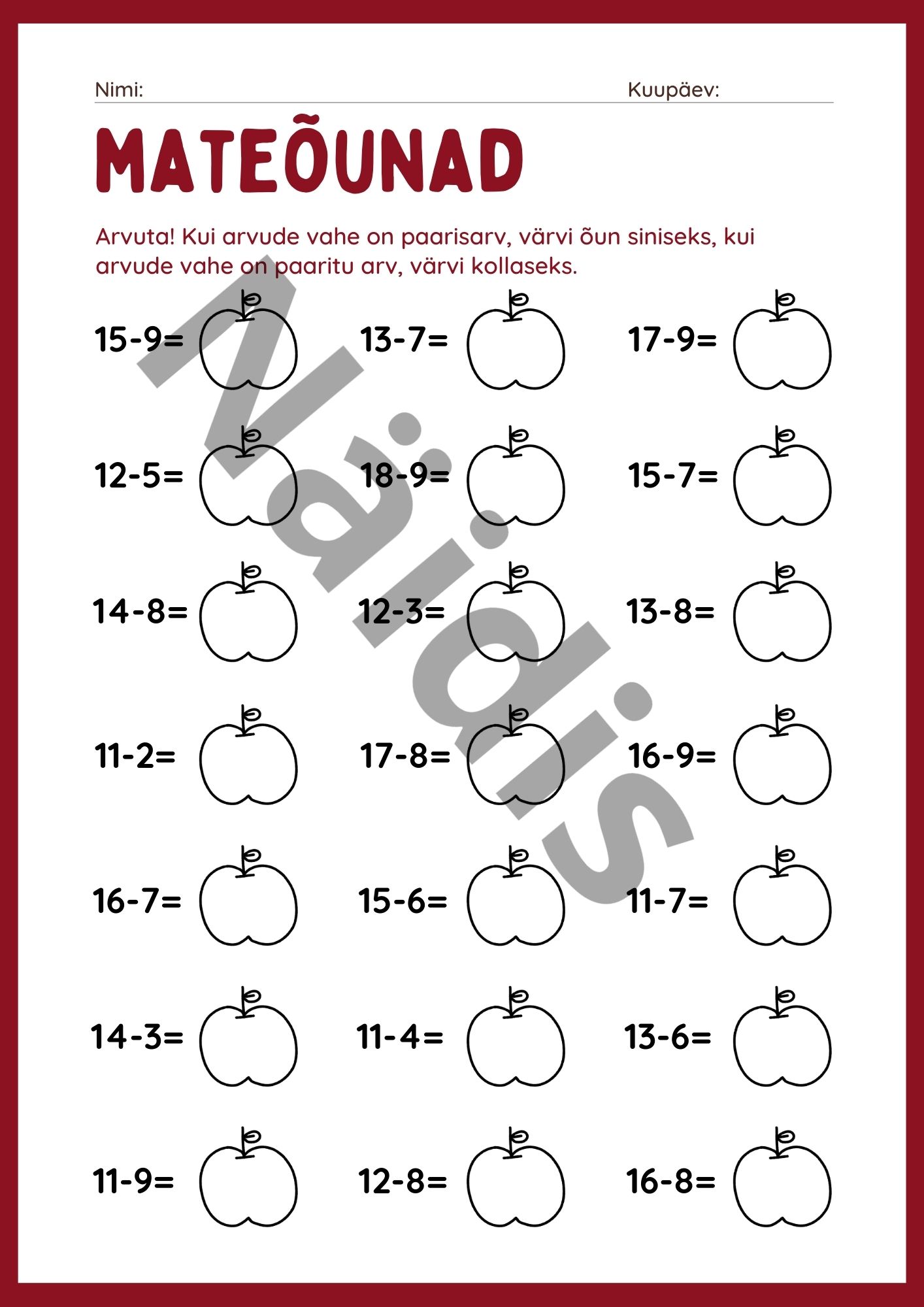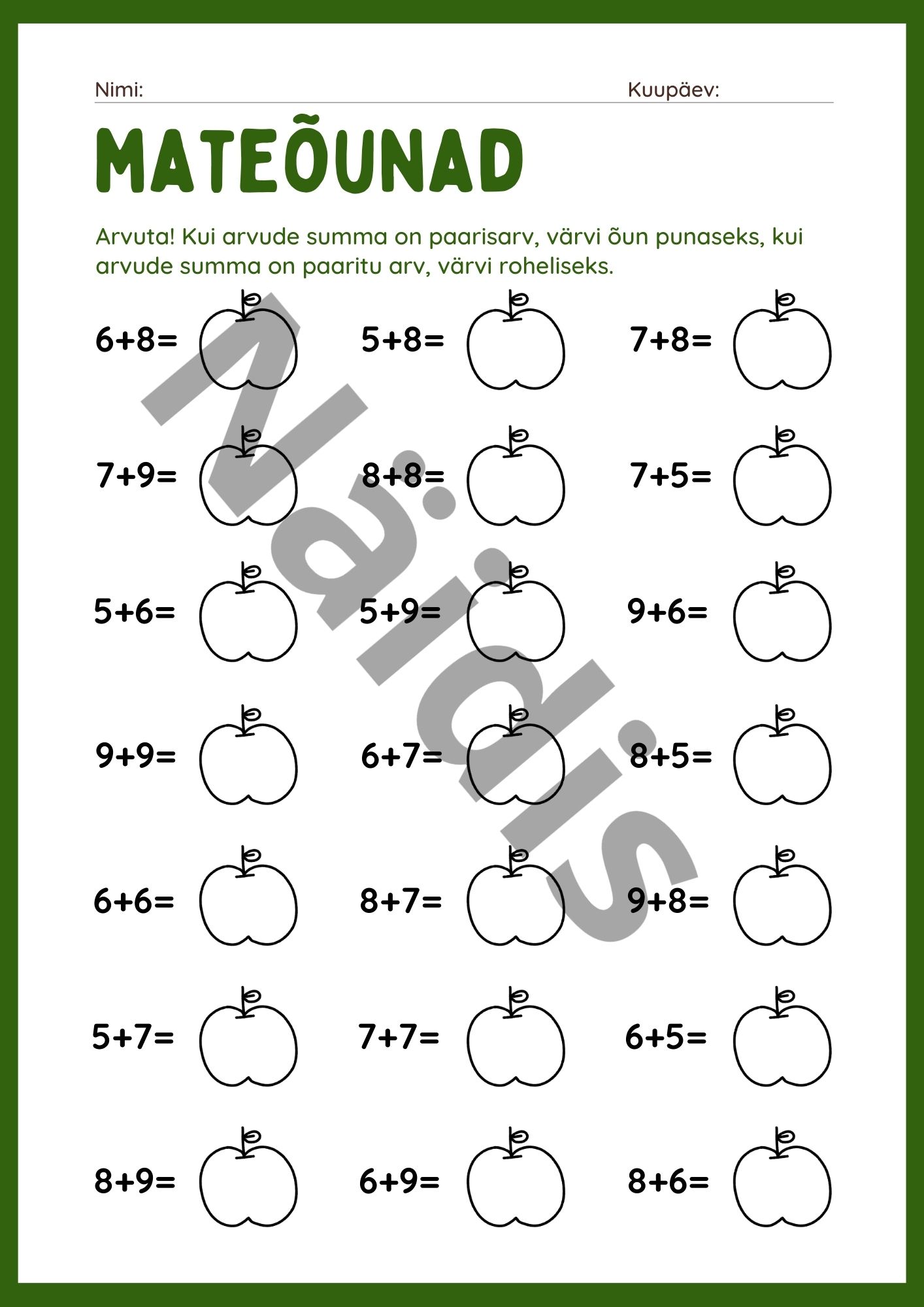 Laps arvutab ja värvib õunad vastavalt juhistele (paarisarv/paaritu arv, vahe või summa).