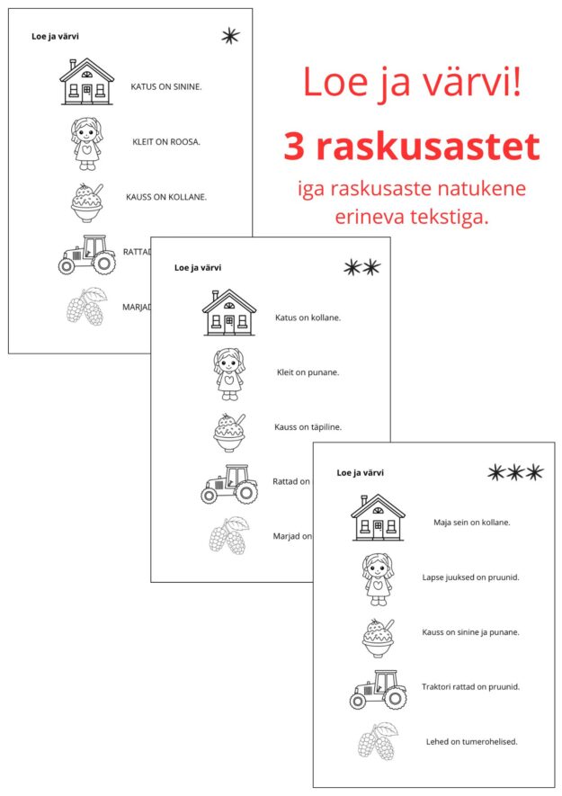 Kolm erineva tasemega töölehte. Laps loeb teksti ja värvib pildi vastavalt tekstile. Tekst on suuruses 20, et oleks lihtsam lugeda.