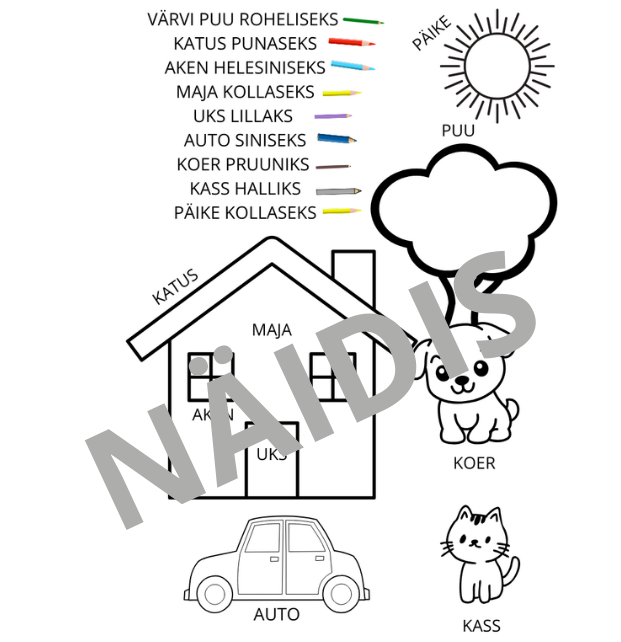 Too värvid mängu ja õpi samal ajal! See värvimisleht aitab lapsel õppida värve ja sõnavara eesti keeles. Lehel on tuttavad kujundid – maja, puu, päike, auto, koer ja kass – koos lihtsate juhistega, millist värvi kasutada.