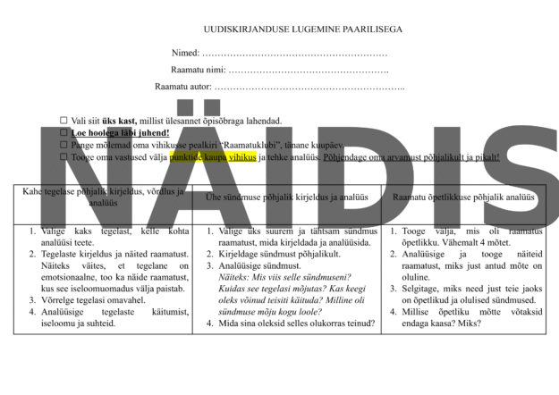 Tööleht, mis suunab õpilasi paarilisega koos analüüsima loetud ilukirjandust. Õpilane valib ühe kolmest põhjalikust analüüsülesandest ja koostab argumenteeritud vastused raamatu tegelaste, sündmuste või õpetlike mõtete kohta.