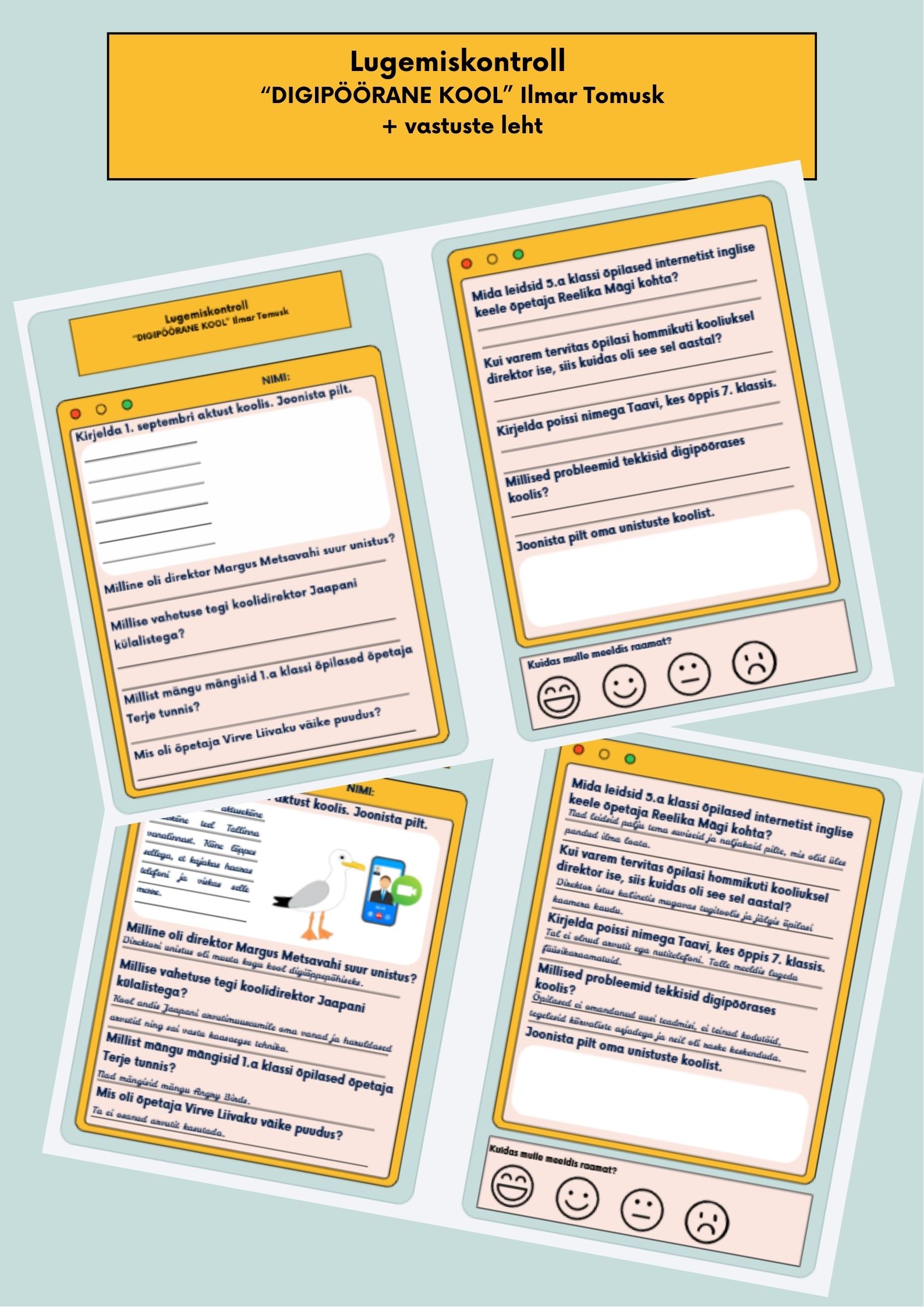 See lugemiskontroll on loodud Ilmar Tomuski humoorika ja seiklusliku raamatu “Digipöörane kool” põhjal. Materjal aitab kontrollida õpilaste tekstimõistmist, arendada arutlusoskust ning sobib suurepäraselt nii tunnitööks kui ka hindeliseks ülesandeks.