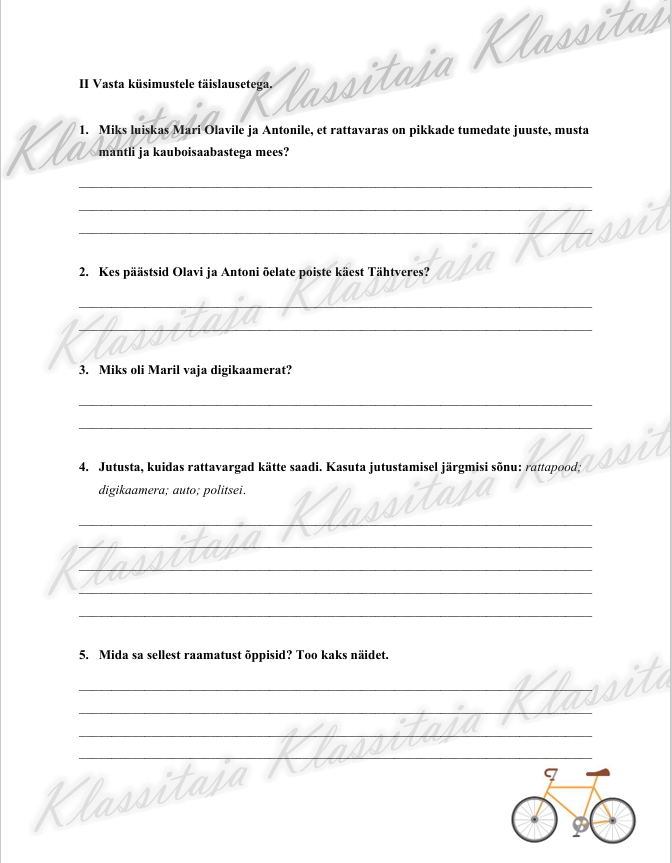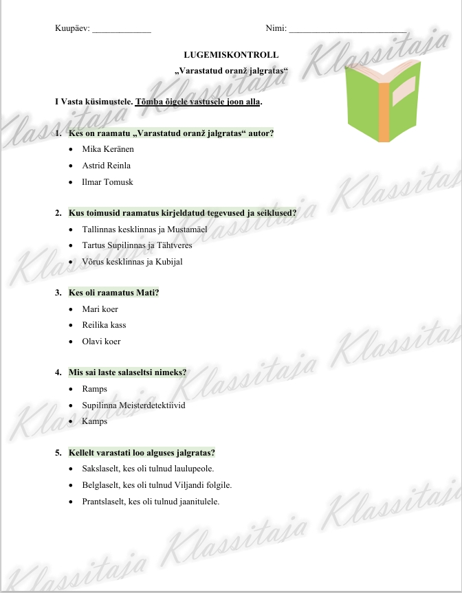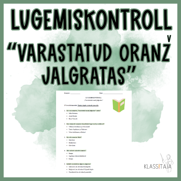 Lugemiskontroll raamatule Mika Keränen “Varastatud oranž jalgratas”. Tööleht on kahepoolne. Lugemiskontrollis on valikvastustega küsimused ja avatud küsimused.