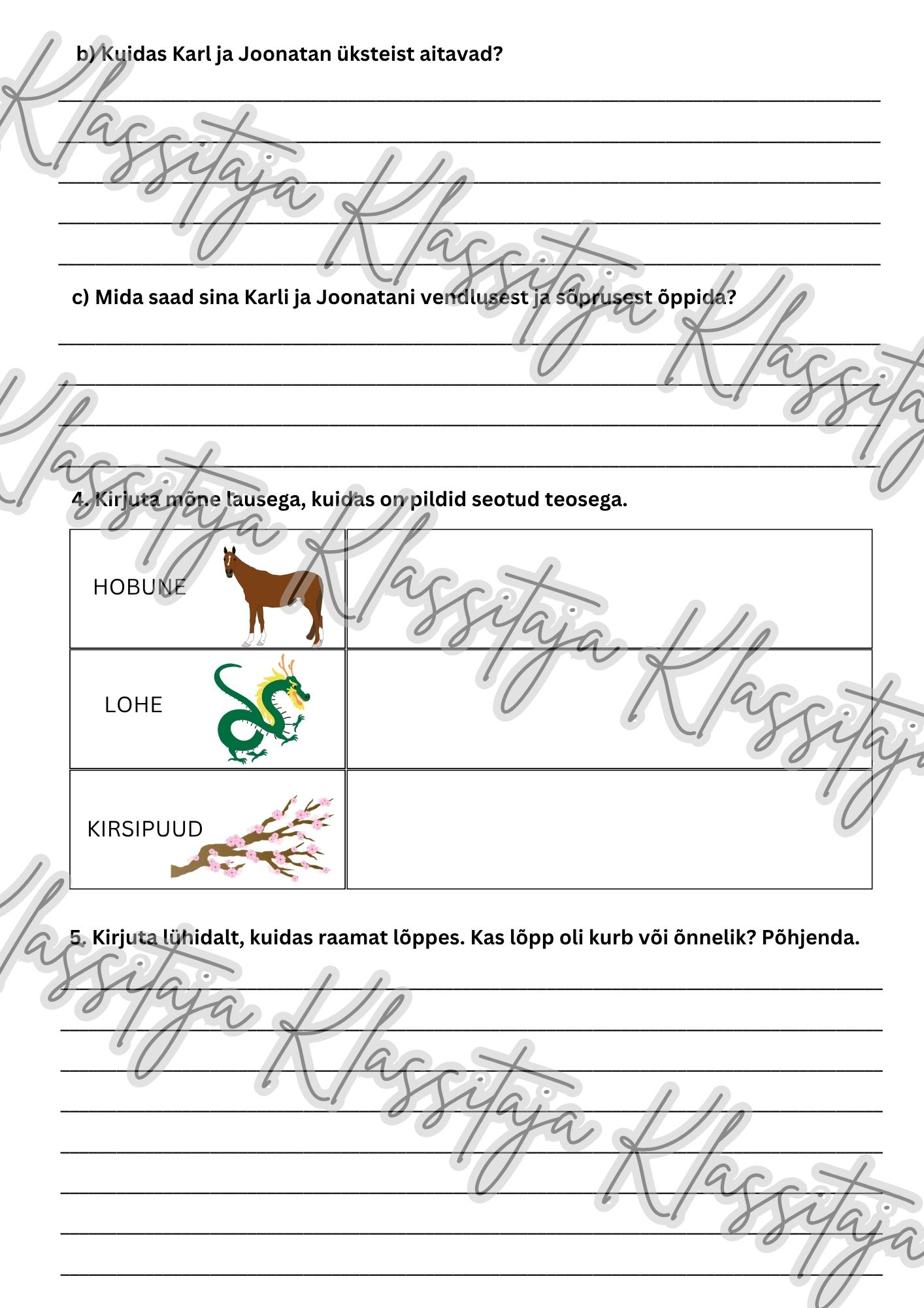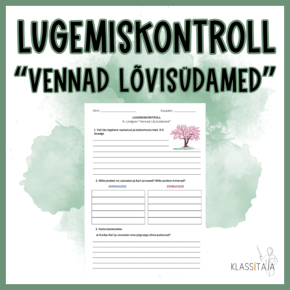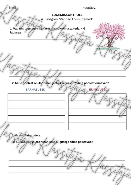 Lugemiskontroll raamatule Astrid Lindgren “Vennad Lõvisüdamed”. Tööleht on kahepoolne. Lugemiskontrollis on avatud küsimused.