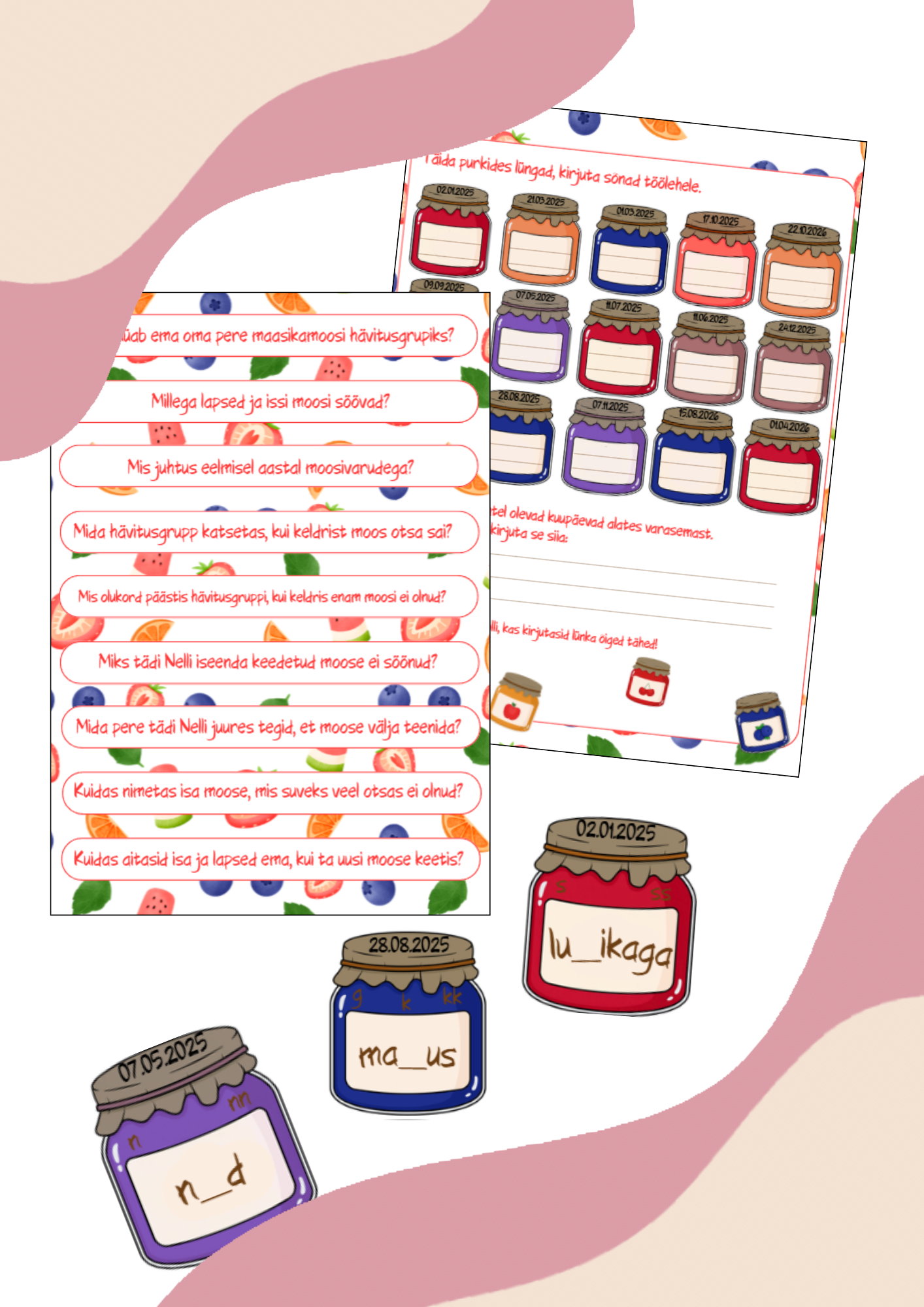 Töölehel lisaülesanne: Purkidel on peal aegumiskuupäevad. Järjesta need ja saa luulerida (Lusikaga moosi tõstan, pannkooki nüüd ma kastan, magus maitse keelel, mis rõõmsaks teeb mul meele). Peale luulerea kirjutamist kontrolli, kas said õiged sõnad.