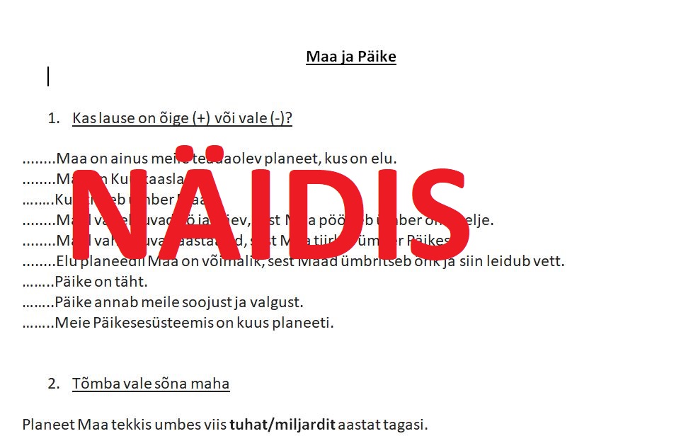 Töölehel on erinevad ülesanded (valede sõnade maha tõmbamine, väitlaused, avatud küsimused). Õpetaja saab kaasa õigete vastustega töölehe. Töölehte saab kasutada teemade õppimisel, kordamisel või hindamisel.