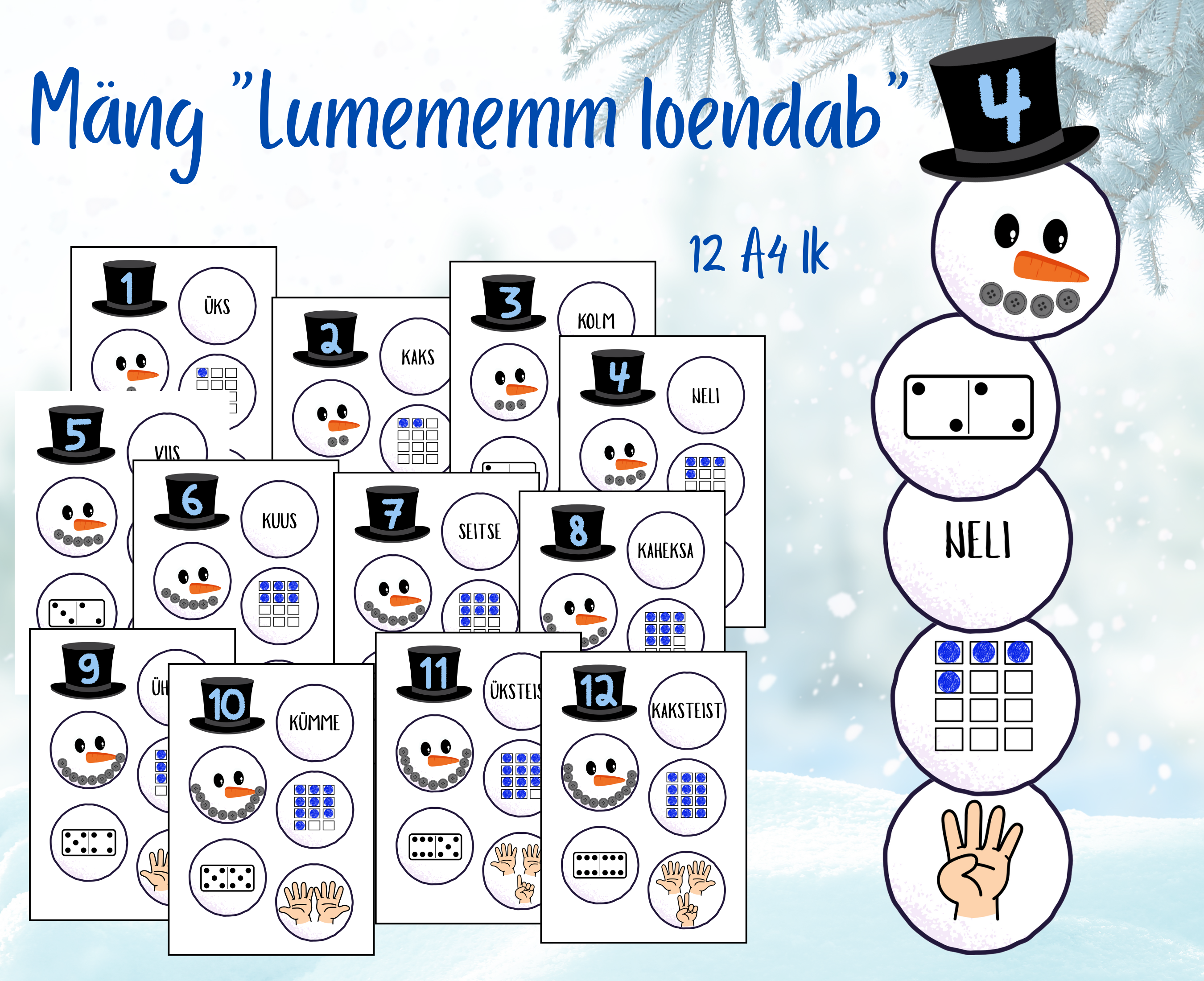 Lõika osad välja ja lamineeri. Laps ehitab lumememme vastavalt arvule sobivatest lumepallidest.