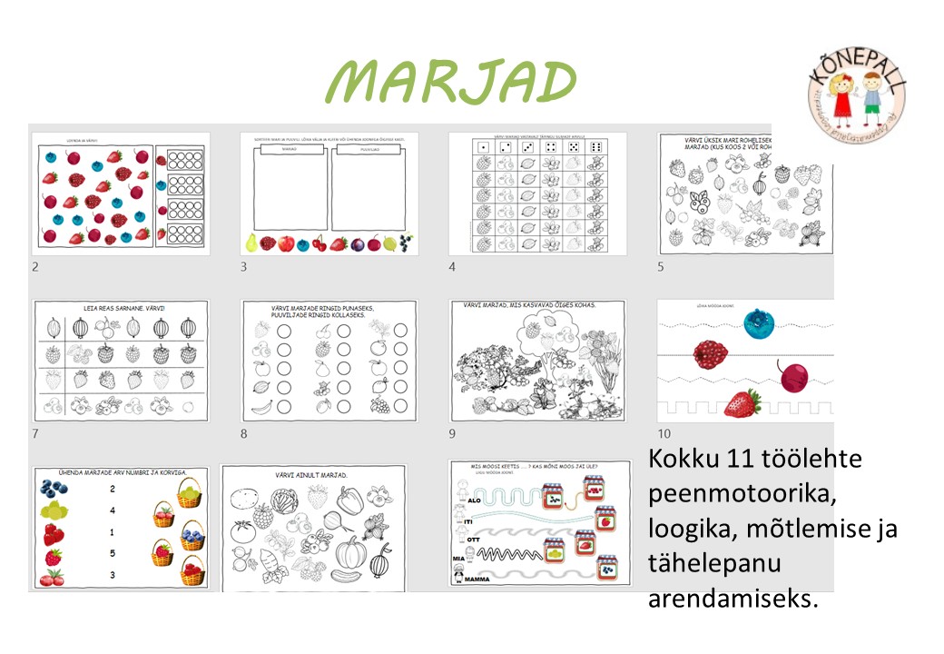 Kokku 11 töölehte peenmotoorika, loogika, mõtlemise ja tähelepanu arendamiseks.