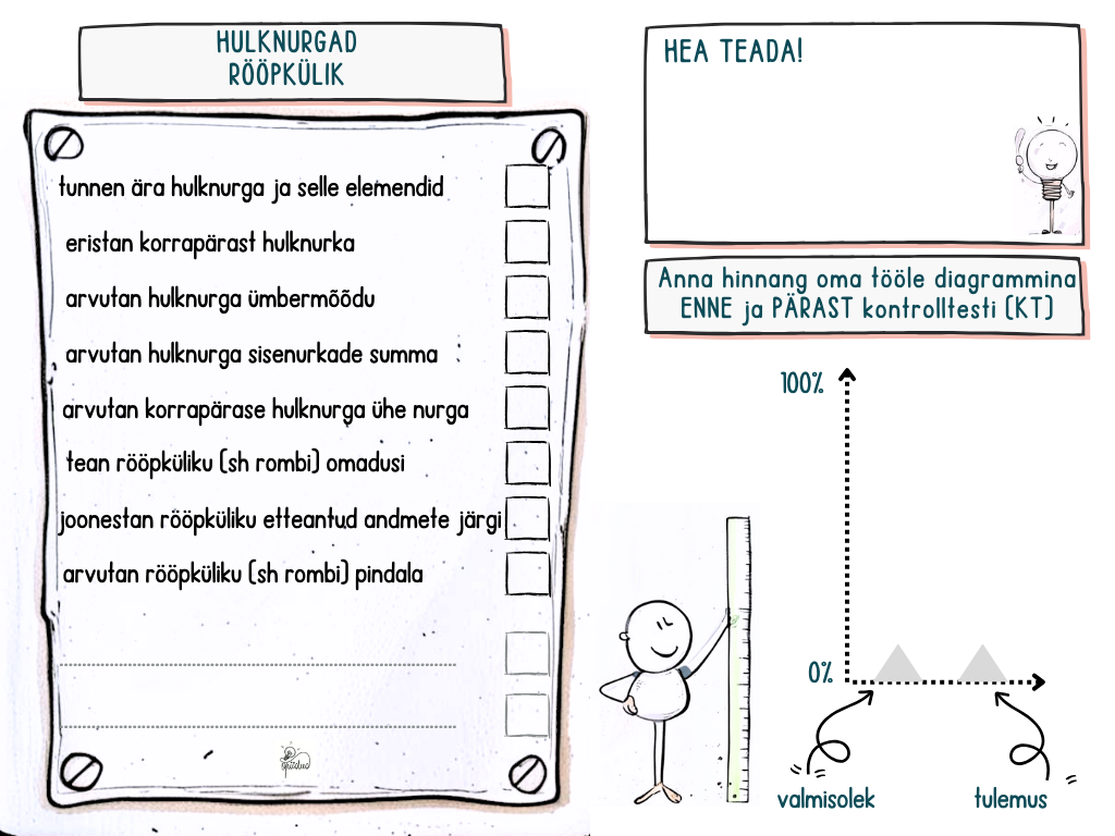 - Igal töölehel on teljestik, kuhu õpilane saab märkida, kuidas on valmis kokkuvõtvaks kontrolltestiks (-tööks) ning pärast testi ka oma tulemuse.