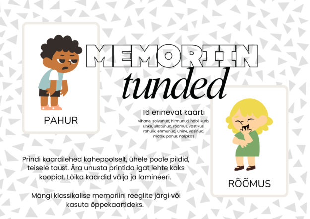 16 kaarti tunnete ja emotsioonide kirjeldamiseks ja memoriini mängimiseks. Mängi klassikalise memoriini reeglite järgi või kasuta õppekaartideks.