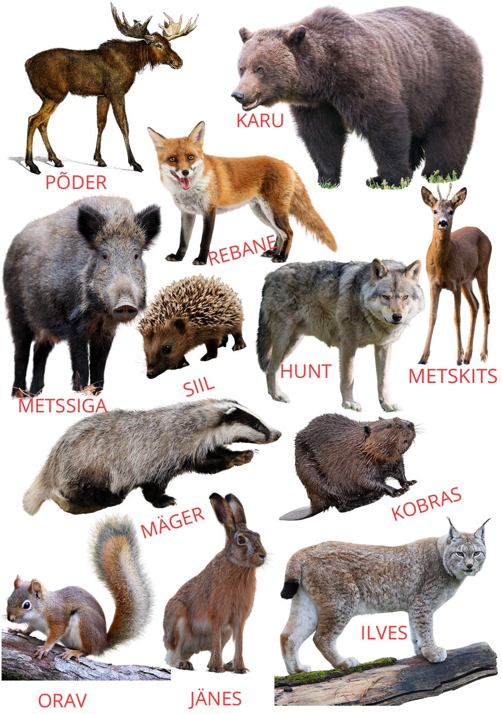 Metsloomad. Plakatil on 12 metslooma ja nende nimed.