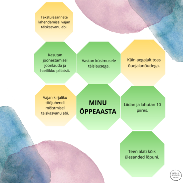 *Õpilane paneb laua keskele kaardi “Minu õppeaasta”. Seejärel hakkab sinna ümber panema talle sobivaid lauseid. Rohelised tähendavad väga head ja kollased, et on veel arenguruumi.